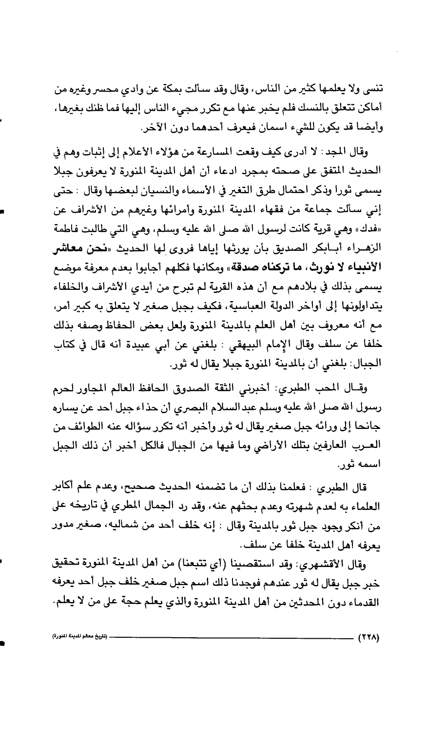 228…تنسى ولا يعلمها كثير من الناس، وقال وقد سألت بمكة عن وادي محسر وغيره من أماكن تتعلق بالنسك فلم يخبر عنها مع تكرر مجيء الناس إليها فما ظنك بغيرها، وأيضاً قد يكون للشيء اسمان فيعرف أحدهما دون الاخر. وقال المجد: لا أدري كيف وقعت المسارعة من هؤلاء الأعلام إلى إثبات وهم في الحديث المتفق على صحته بمجرد ادعاء أن أهل المدينة المنورة لا يعرفون جبلاً يسمى ثور وذكراً احتمال طرق التغير في الاسماء والنسيان لبعضها وقال: حتى إني سألت جماعة من فقهاء المدينة المنورة وأمرائها وغيرهم من الأشراف عن " فدك " وهي قرية كانت لرسول الله صلى الله عليه وسلم، وهي التي طالبت فاطمة الزهراء أبا بكر الصديق بأن يورثها إياها فروى لها الحديث " نحن معاشر الأنبياء لا نورث، ما تركناه صدقة " ومكانها فكلهم أجابوا بعد معرفة موضع يسمى بذلك في بلادهم مع أن هذه القرية لم تبرح من أيدي الأشراف والخلفاء يتداولونها إلى أواخر الدولة العباسية، فكيف بجبل صغير لا يتعلق به كبير أمر، مع أنه معروف بين أهل العلم بالمدينة المنورة ولعل بعض الحفاظ وصفه بذلك خلفاً عن سلف وقال الإمام البيهقي: بلغني عن أبي عبيدة أنه قال في كتاب الجبال: بلغني أن بالمدينة المنورة جبلاً يقال له ثور. وقال المحب الطبري: أخبرني الثقة الصدوق الحافظ العالم المجاور لحرم رسول الله صلى الله عليه وسلم عبد السلام البصري أن حذاء جبل أحد عن يساره جانحاً إلى ورائه جبل صغير يقال له ثور وأخبر أنه تكرر سؤاله عنه الطوائف من العرب العارفين بتلك الأراضي وما فيها من الجبال فالكل أخبر أن ذلك الجبل اسمه ثور. قال الطبري: فعلمنا بذلك أن ما تضمنه الحديث صحيح، وعدم علم أكابر العلماء به لعدم شهرته وعدم بحثهم عنه، وقد رد الجمال المطري في تاريخه على من أنكر وجود جبل ثور بالمدينة وقال: إنه خلف أحد من شماليه، صغير مدور يعرفه أهل المدينة خلفاً عن سلف. وقال الأقشهري: وقد استقصينا (أي تتبعنا) من أهل المدينة المنورة تحقيق خبر جبل يقال له ثور عندهم فوجدنا ذلك اسم جبل صغير خلف جبل أحد يعرفه القدماء دون المحدثين من أهل المدينة المنورة والذي يعلم حجة على من لا يعلم.…