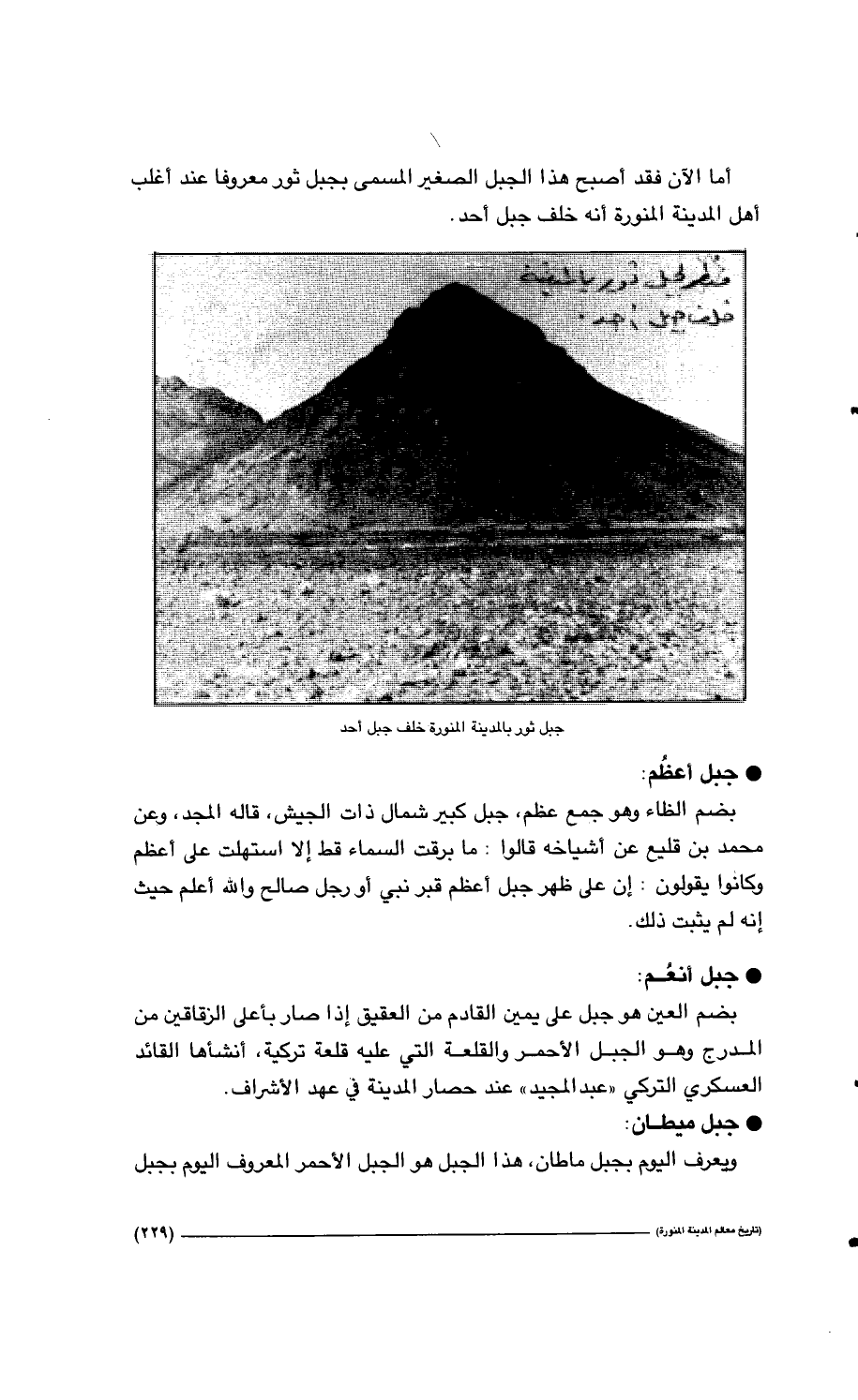 229…أما الان فقد أصبح هذا الجبل الصغير المسمى بجبل ثور معروفاً عند أغلب أهل المدينة المنورة أنه خلف جبل أحد. جبل ثور بالمدينة المنورة خلف جبل أحد