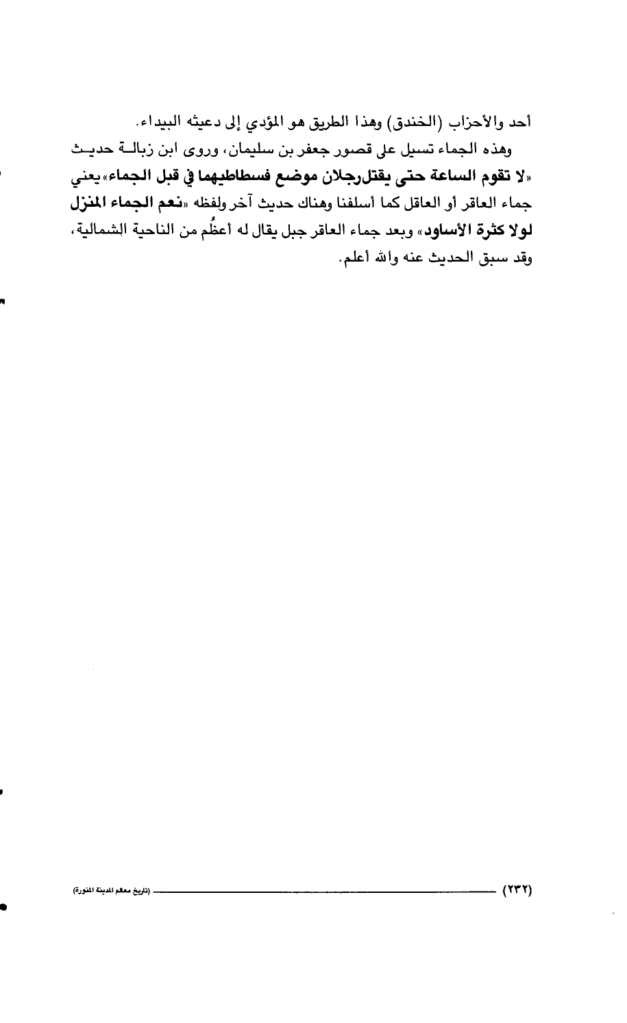 وهذه الجماء تسيل على قصور جعفر بن سليمان، وروى ابن زبالة حديث " لا تقوم الساعة حتى يقتل رجلان موضع فسطاطيهما في قبل الجماء " يعني جماء العاقر أو العاقل كما أسلفنا وهناك حديث آخر ولفظه " نعم الجماء المنزل لولا كثرة الأساود " وبعد جماء العاقر جبل له أعظُم من الناحية الشمالية، وقد سبق الحديث عنه والله أعلم.…