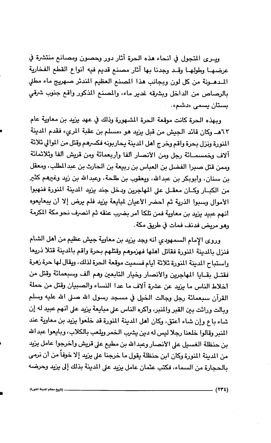 234…ويرى المتجول في أنحاء هذه الحرة آثار دور وحصون ومصانع منتشرة في عرضها وطولها وقد وجدنا بها آثار مصنع قديم فيه أنواع القطع الفخارية المدهونة من كل لون وبجانب هذا المصنع العظيم المندثر صهريج ماء مطلي بالرصاص من الداخل وبشرقه غدير ماء، والمصنع المذكور واقع جنوب شرقي بستان يسمى " دشم ".