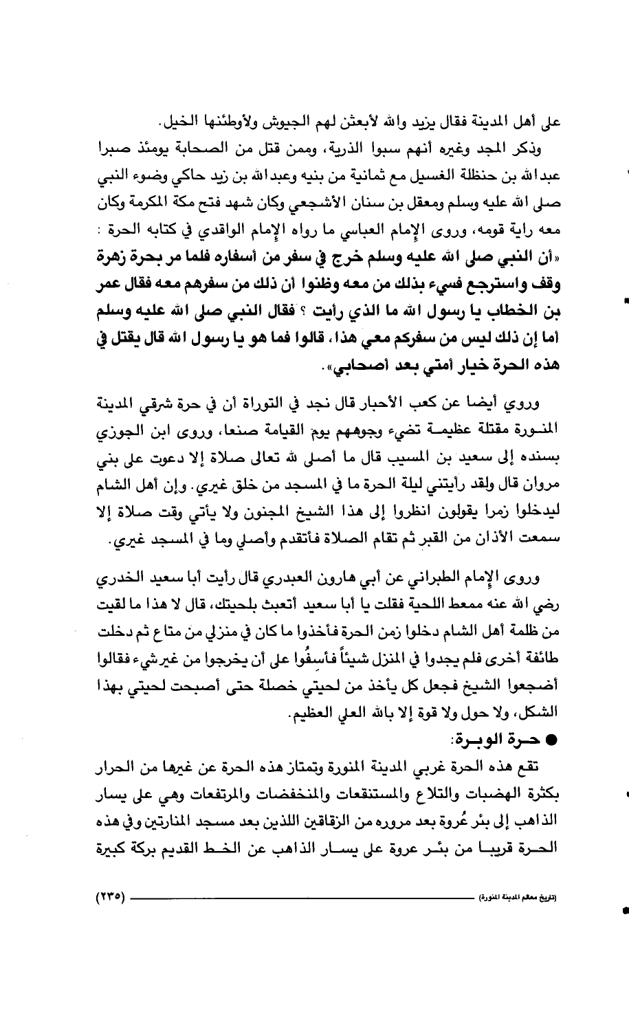 235…على أهل المدينة فقال يزيد والله لأبعثن لهم الجيوش ولأوطئنها الخيل. وذكر المجد وغيره أنهم سبوا الذرية، وممن قتل من الصحابة يومئذ صبراً عبد الله بن حنظلة الغسيل مع ثمانية من بنيه وعبد الله بن زيد حاكي وضوء النبي صلى الله عليه وسلم ومعقل بن سنان الأشجعي وكان شهد فتح مكة المكرمة وكان معه راية قومه، وروى الإمام العباسي ما رواه الإمام الواقدي في كتابه الحرة: " أن النبي صلى الله عليه وسلم خرج في سفر من أسفاره فلما مر بحرة زهرة وقف واسترجع فسيء بذلك من معه وظنوا أن ذلك من سفرهم معه فقال عمر بن الخطاب يا رسول الله مالذي رأيت؟ قال النبي صلى الله عليه وسلم أما إن ذلك ليس من سفركم معي هذا، قالوا فما هو يا رسول الله قال يقتل في هذه الحرة خيار أمتي بعد أصحابي ".