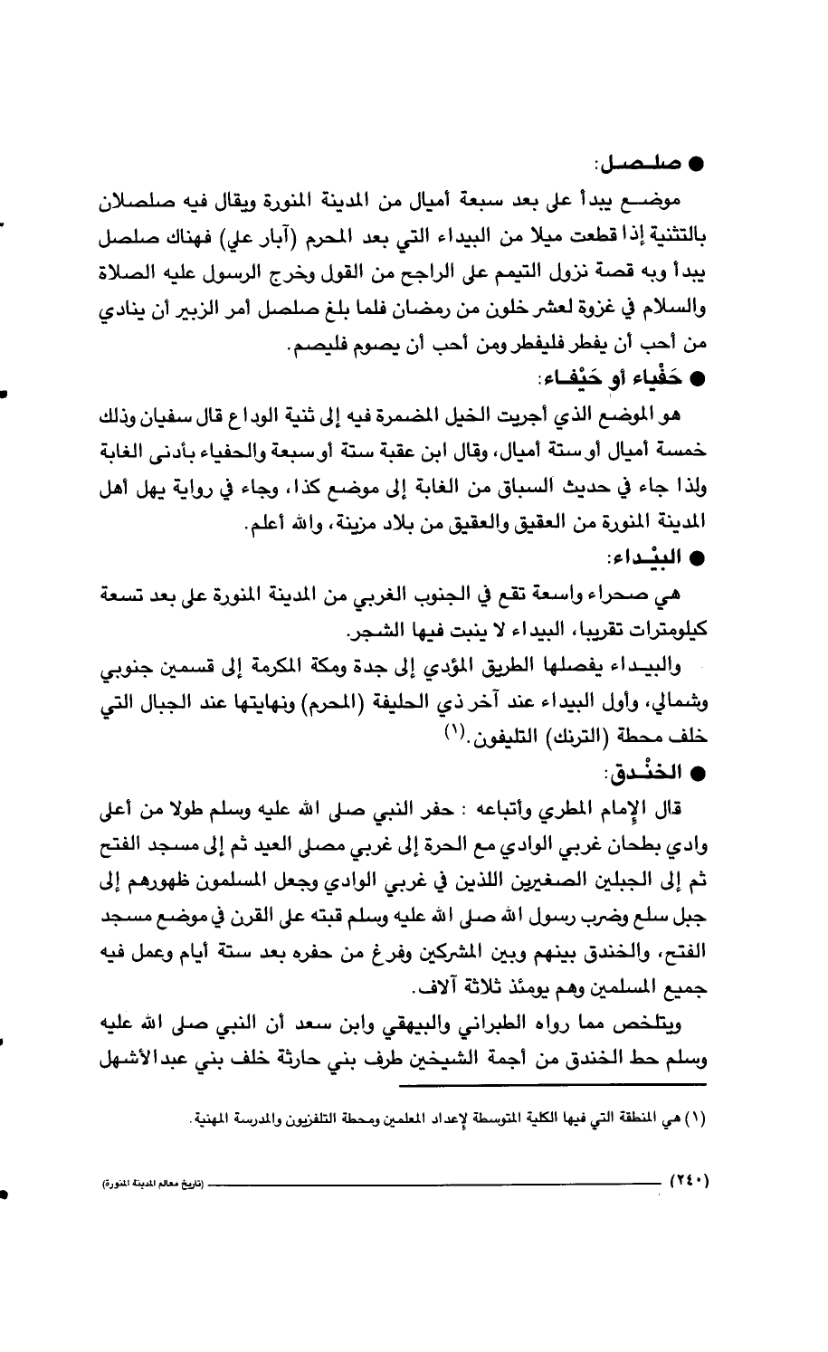 * الخندق: قال الإمام المطري وأتباعه: حفر النبي صلى الله عليه وسلم طولاً من أعلى وادي بطحان غربي الوادي مع الحرة إلى غربي مصلى العيد ثم إلى مسجد الفتح ثم إلى الجبلين الصغيرين اللذين في غربي الوادي وجعل المسلمون ظهورهم إلى جبل سلع وضرب رسول الله صلى الله عليه وسلم قبته على القرن في موضع مسجد الفتح، والخندق بينهم وبين المشركين وفرغ من حفرة بعد ستة أيام وعمل فيه جميع المسلمين وهم يومئذ ثلاثة آلاف. ويتلخص مما رواه الطبراني والبيهقي وابن سعد أن النبي صلى الله عليه وسلم حط الخندق من أجمة الشيخين طرف بني حارثة خلف بني عبد الأشهل…