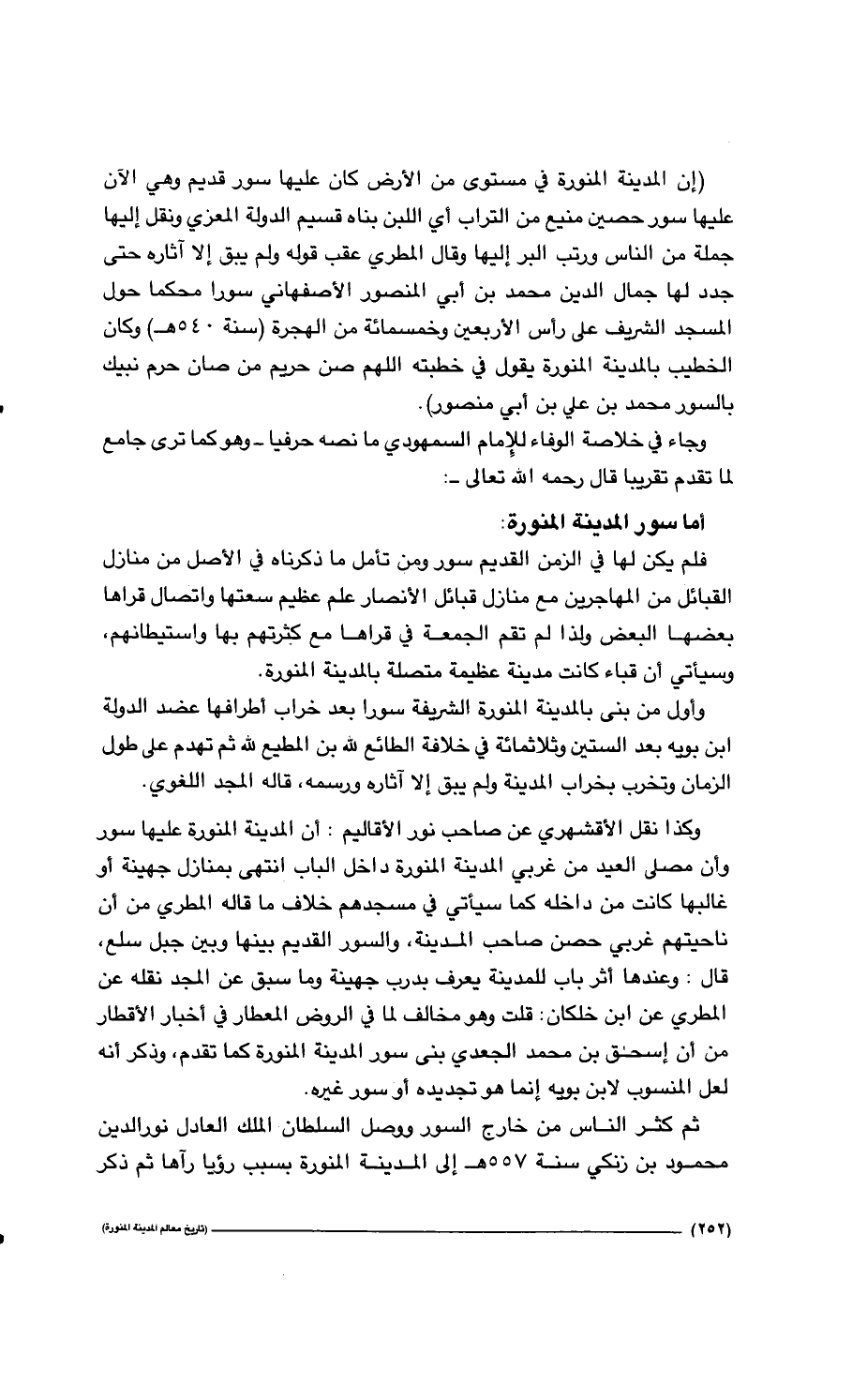 252… (إن المدينة المنورة في مستوى من الأرض كان عليها سور قديم وهي الآن عليها سور حصين منيع من التراب أي اللبن بناه قسيم الدولة المعزي ونقل إليها جملة من الناس ورتب البر إليها وقال المطري عقب قوله ولم يبق إلا آثاره حتى جدد لها جمال الدين محمد بن أبي المنصور الأصفهاني سوراً محكماً حول المسجد الشريف على رأس الأربعين وخمسمائة من الهجرة (سنة 540 هـ) وكان الخطيب بالمدينة المنورة يقول في خطبته اللهم صن حريم من صان حرم نبيك بالسور محمد بن علي بن أبي منصور).