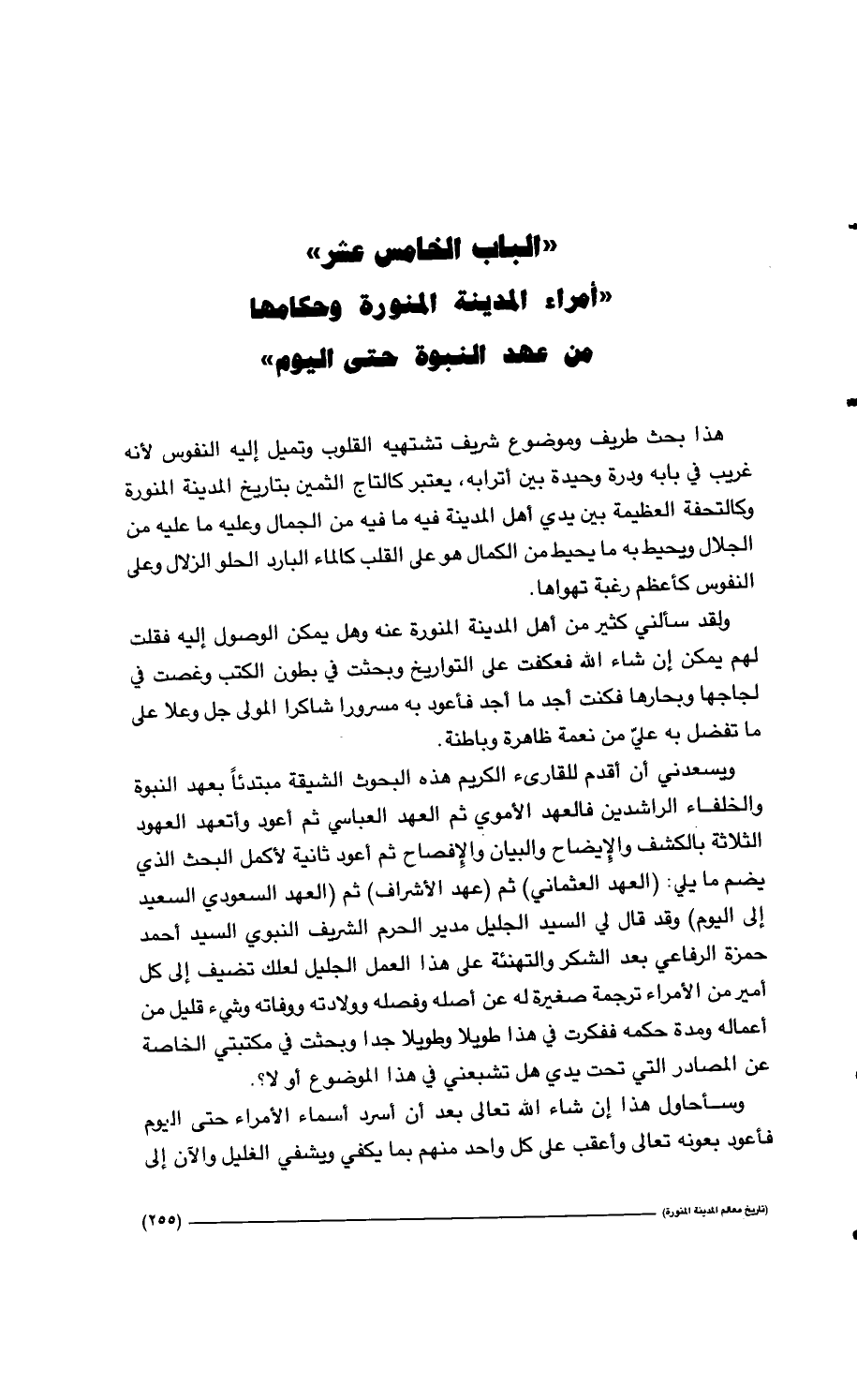 هذا بحث طريف وموضوع شريف تشتهيه القلوب وتميل إليه النفوس لأنه غريب في بابه ودرة وحيدة بين أترابه، يعتبر كالتاج الثمين بتاريخ المدينة المنورة وكالتحفة العظيمة بين يدي أهل المدينة فيه ما فيه من الجمال وعليه ما عليه من الجلال ويحيط به ما يحيط من الكمال هو على القلب كالماء البارد الحلو الزلال وعلى النفوس كأعظم رغبة تهواها. ولقد سألني كثير من أهل المدينة المنورة عنه وهل يمكن الوصول إليه فقلت لهم يمكن إن شاء الله فعكفت على التواريخ وبحثت في بطون الكتب وغصت في لجاجها وبحارها فكنت أجد ما أجد فأعود به مسروراً شاكراً المولى جل وعلا على ما تفضل به عليّ من نعمه ظاهرة وباطنة. ويسعدني أن أقدم للقارئ الكريم هذه البحوث الشيقة مبتدئاً بعهد النبوة والخلفاء الراشدين فالعهد الأموي ثم العهد العباسي ثم أعود وأتعهد العهود الثلاثة بالكشف والإيضاح والبيان والإفصاح ثم أعود ثانية لأكمل البحث الذي يضم ما يلي: (العهد العثماني) ثم (عهد الأشراف) ثم (العهد السعودي السعيد إلى اليوم) وقد قال لي السيد الجليل مدير الحرم الشريف النبوي السيد أحمد حمزة الرفاعي بعد الشكر والتهنئة على هذا العمل الجليل لعلك تضيف إلى كل أمير من الأمراء ترجمة صغيرة له عن أصله وفصله وولادته ووفاته وشيء قليل من أعماله ومدة حكمه ففكرت في هذا طويلاً وطويلاً جداً وبحثت في مكتبتي الخاصة عن المصادر التي تحت يدي هل تشبعني في هذا الموضوع أو لا؟. وسأحاول هذا إن شاء الله تعالى بعد أن أسرد أسماء الأمراء حتى اليوم فأعود بعونه تعالى وأعقب على كل واحد منهم بما يكفي ويشفي الغليل والآن إلى…