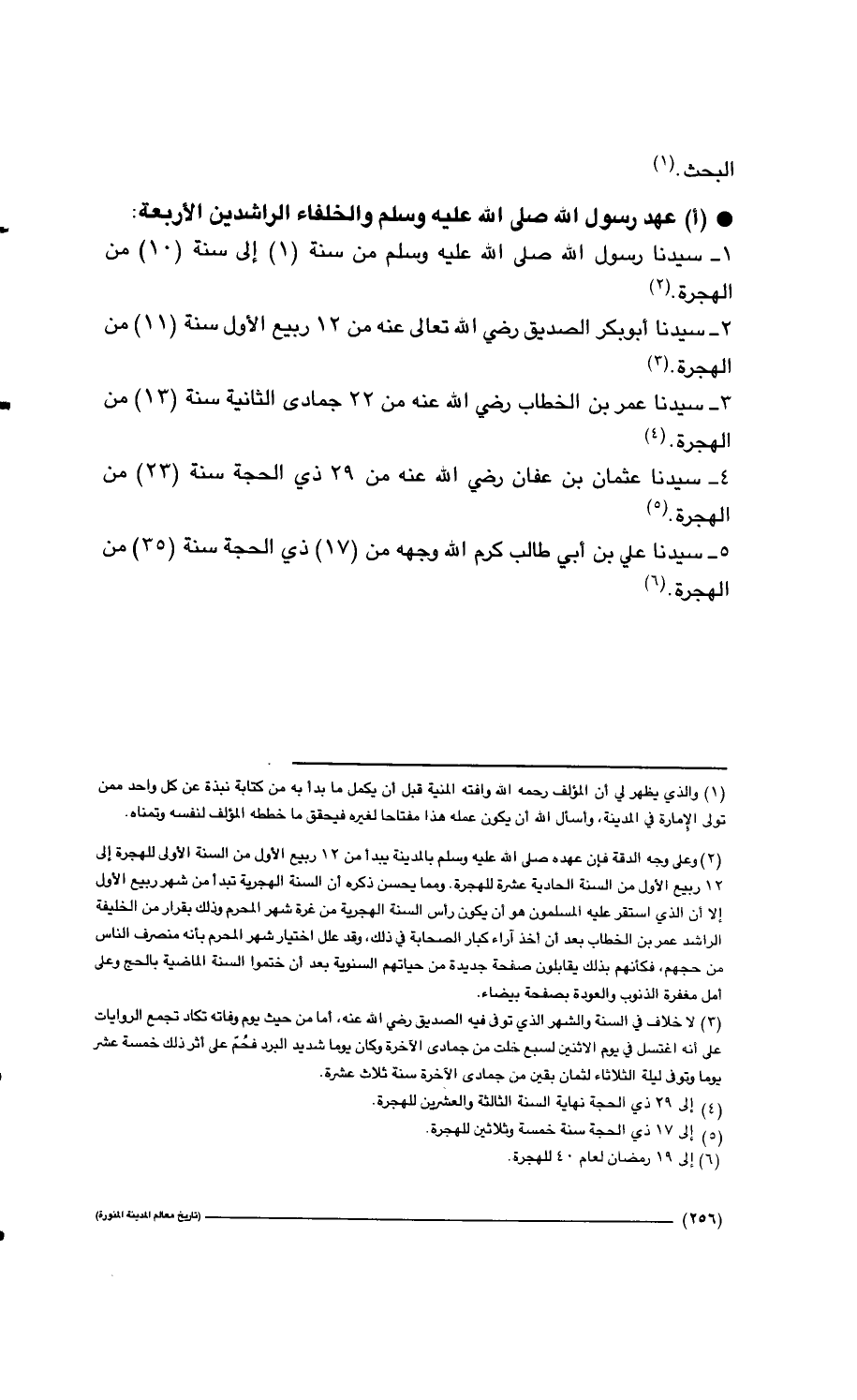 (1) والذي يظهر لي أن المؤلف رحمه الله وافته المنية قبل أن يكمل ما بدأ به من كتابه نبذة عن كل واحد ممن تولى الإمارة في المدينة، وأسأل الله أن يكون عمله هذا مفتاحاً لغيره فيحقق ما خططه المؤلف لنفسه وتمناه. (2) وعلى وجه الدقة فإن عهده صلى الله عليه وسلم بالمدينة يبدأ من 12 ربيع الأول من السنة الأولى للهجرة إلى 12 ربيع الأول من السنة الحادية عشرة للهجرة. ومما يحسن ذكره أن السنة الهجرية تبدأ من شهر ربيع الأول إلا أن الذي استقر عليه المسلمون هو أن يكون رأس السنة الهجرية من غرة شهر المحرم وذلك بقرار من الخليفة الراشد عمر بن الخطاب بعد أن أخذ آراء كبار الصحابة في ذلك، وقد علل اختيار شهر المحرم بأنه منصرف الناس من حجهم، فكأنهم بذلك يقابلون صفحة جديدة من حياتهم السنوية بعد أن ختموا السنة الماضية بالحج وعلى أمل مغفرة الذنوب والعودة بصفحة بيضاء. (3) لا خلاف في السنة والشهر الذي توفي فيه الصديق رضي الله عنه، وأما من حيث يوم وفاته تكاد تجمع الروايات على أنه اغتسل في يوم الإثنين لسبع خلت من جمادى الاخرة وكان يوماً شديد البرد فحُمّ على أثر ذلك خمسة عشر يوماً وتوفي ليلة الثلاثاء لثمان بقين من جمادى الآخرة سنة ثلاث عشرة. (4) إلى 29 ذي الحجة نهاية السنة الثالثة والعشرين للهجرة. (5) إلى 17 ذي الحجة سنة خمسة وثلاثين للهجرة. (6) إلى 19 رمضان لعام 40 للهجرة.