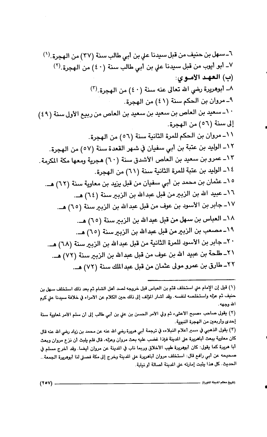 (1) قيل إن الإمام علي استخلف قثم بن العباس قبل خروجه لصد أهل الشام ثم بعد ذلك استخلف سهل بن حنيف ثم عزله واستخلصه لنفسه. وقد أشار المؤلف إلى ذلك حين الكلام عن الأمراء في خلافة سيدنا علي كرم الله وجهه. (2) يقول صاحب " صبح العشى " ثم ولي الأمير الحسن بن علي بن أبي طالب إلى ان سلم الأمر لمعاوية سنة إحدى وأربعين من الهجرة النبوية. (3) يقول الذهبي في " سير أعلام النبلاء " في ترجمة أبي هريرة رضي الله عنه عن محمد بن زياد رضي الله عنه قال كان معاوية يبعث أبا هريرة على المدينة فإذا غضب عليه بعث مروان وعزله، قال فلم يلبث أن نزع مروان وبعث أبا هريرة كما يقول: كان أبو هريرة طيب الأخلاق وربما ناب في المدينة عن مروان أيضاً. وقد أخرج مسلم في صحيحه عن أبي رافع قال: استخلف مروان أبا هريرة على المدينة وخرج إلى مكة فصلى لنا أبو هريرة الجمعة .. الحديث. كل هذا يثبت إمارته على المدينة أصاله أو نيابة.