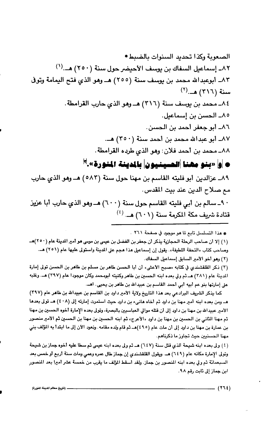 * هذا التسلسل تابع لما هو موجود في صفحة 261. (1) إلا أن صاحب الرحلة الحجازية يذكر أن جعفر بن الفضل بن عيسى بن موسى هو أمير المدينة عام (250) هـ وصاحب كتاب " التحفة اللطيفة ". يقول 'ن إسماعيل هذا هجم على المدينة واستولى عليها عام (251) هـ. (2) وهو أخو الأمير السابق إسماعيل السفاك. (3) ذكر القلقشندي في كتابه " صبح الأعشى " أن أبا الحسن طاهر بن مسلم بن طاهر بن الحسن تولى إمارة المدينة عام (381) هـ ثم ولي بعده ابنه الحسين بن طاهر وكنيته أبو محمد وكان موجوداً عام (379) وغلبه على إمارتها بنو عم أبيه أبي أحمد القاسم بن عبيد الله بن طاهر بن يحيى. ا هـ. كما يذكر الشريف البرادعي بعد هذا التاريخ ولاية الأمير داود بن القاسم بن عبيد الله بن طاهر عام (397) هـ ومن بعده ابنه أمير مهنا بن داود إلى أن قتله موالي العباسيين بالبصرة، وتولى بعده الإمارة أخوة الحسين بن مهنا ثم مهنى الثاني بن الحسين بن مهنا بن داود " الأعرج " ثم ابنه الحسين بن مهنا بن الحسين ثم الأمير منصور بن عمارة بن مهنا بن داود إلى أن مات عام (495) هـ ثم قام ولده مقامه.