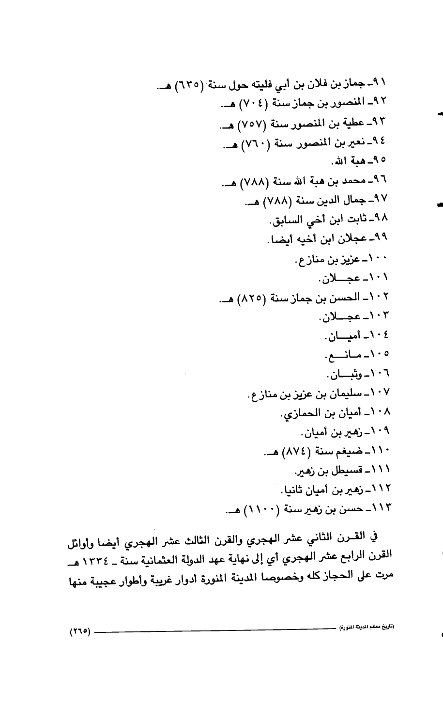 113 - حسن بن زهير سنة (1100) هـ. في القرن الثاني عشر الهجري والقرن الثالث عشر الهجري أيضاً وأوائل القرن الرابع عشر الهجري أي إلى نهاية عهد الدولة العثمانية سنة ـ 1334 هـ مرت على الحجاز كله وخصوصاً لمدينة المنورة أدوار غريبة وأطوار عجيبة منها…