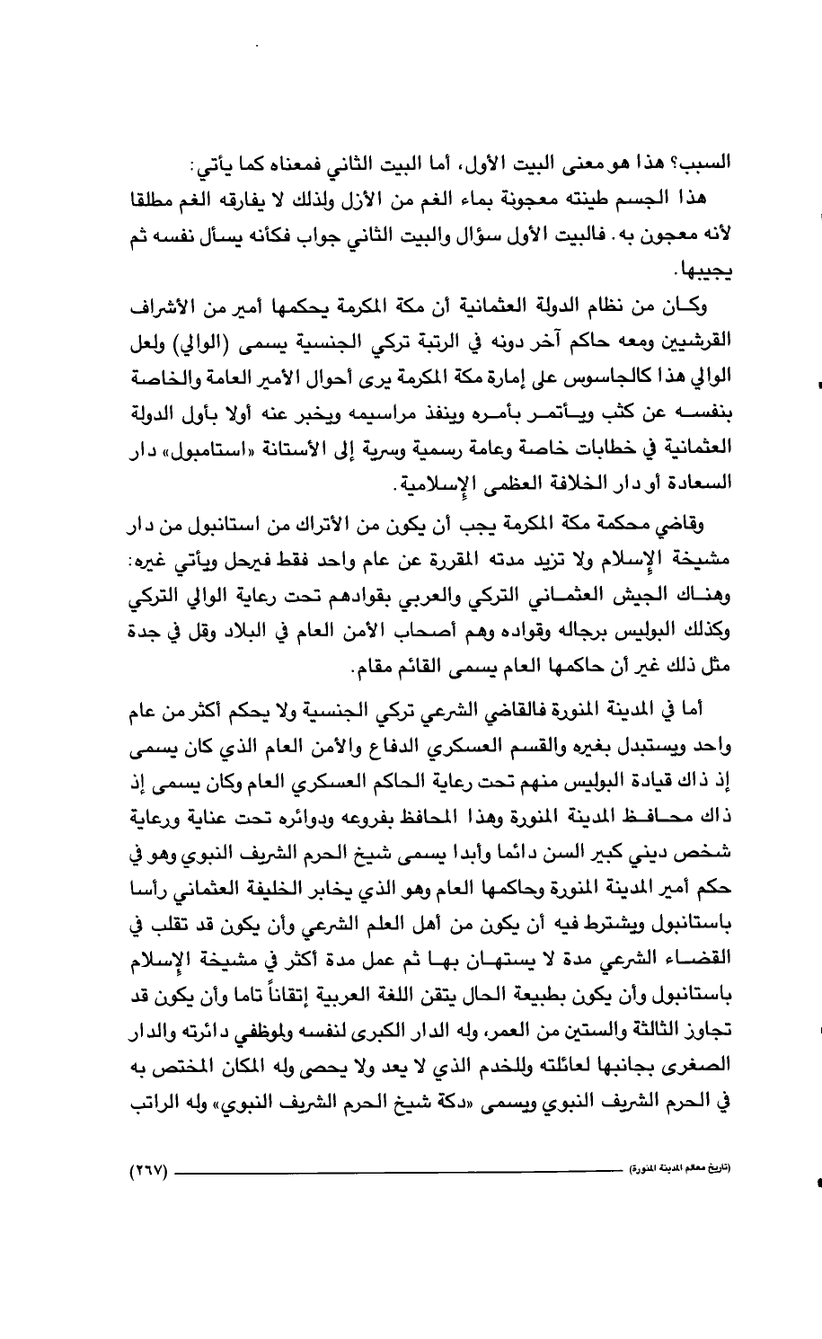 267…السبب؟ هذا هو معنى البيت الأول، أما البيت الثاني فمعناه كما يأتي: هذا الجسم طينته معجونة بماء الغم من الأزل ولذلك لا يفارقه الغم مطلقاً لأنه معجون به، فالبيت الأول سؤال والبيت الثاني جواب فكأنه يسأل نفسه ثم يجيبها. وكان من نظام الدولة العثمانية أن مكة المكرمة يحكمها أمير من الأشراف القرشيين ومعه حاكم آخر دونه في الرتبة تركي الجنسية يسمى (الوالي) ولعل الوالي هذا كالجاسوس على إمارة مكة المكرمة يرى أحوال الأمير العامة والخاصة بنفسه عن كثب ويأتمر بأمره وينفذ مراسيمه ويخبر عنه أولاً بأول الدولة العثمانية في خطابات خاصة وعامة رسمية وسرية إلى الأستانة " استامبول " دار السعادة أو دار الخلافة العظمى الإسلامية. وقاضي محكمة مكة المكرمة يجب أن يكون من الأتراك من استانبول من دار مشيخة الإسلام ولا تزيد مدته المقررة عن عام واحد فقط فيرحل ويأتي غيره: وهناك الجيش العثماني التركي والعربي بقوادهم تحت رعاية الوالي التركي وكذلك البوليس برجاله وقواده وهم أصحاب الأمن العام في البلاد وقل في جدة مثل ذلك غير أن حاكمها العام يسمى القائم مقام. أما في المدينة المنورة فالقاضي الشرعي تركي الجنسية ولا يحكم أكثر من عام واحد ويستبدل بغيره والقسم العسكري الدفاع والأمن العام الذي كان يسمى إذ ذاك قيادة البوليس منهم تحت رعاية الحاكم العسكري العام وكان يسمى إذ ذاك محافظ المدينة المنورة وهذا المحافظ بفروعه ودوائره تحت عناية ورعاية شخص ديني كبير السن دائماً وأبداً يسمى شيخ الحرم الشريف النبوي وهو في حكم أمير المدينة المنورة وحاكمها العام وهو الذي يخابر الخليفة العثماني رأساً باستانبول ويشترط فيه أن يكون من أهل العلم الشرعي وأن يكون قد تقلب في القضاء الشرعي مدة لا يستهان بها ثم عمل مدة أكثر في مشيخة الإسلام باستانبول وأن يكون بطبيعة الحال يتقن اللغة العربية إتقاناً تاماً وأن يكون قد تجاوز الثالثة والستين من العمر، وله الدار الكبرى لنفسه ولموظفي دائرته والدار الصغرى بجانبها لعائلته وللخدم الذي لا يعد ولا يحصى وله المكان المختص به في الحرم الشريف النبوي ويسمى " دكة شيخ الحرم الشريف النبوي" وله الراتب…