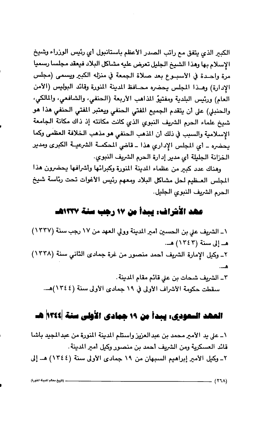 268…الكبير الذي يتفق مع راتب الصدر العظم باستانبول أي رئيس الوزراء وشيخ الإسلام بها وهذا الشيخ الجليل تعرض عليه مشاكل البلاد فيعقد مجلساً رسمياً مرة واحدة في الإسبوع بعد صلاو الجمعة في منزله الكبير ويسمى (مجلس الإدارة) وهذا المجلس يحضره محافظ المدينة المنورة وقائد البوليس (الأمن العام) ورئيس البلدية ومفتيّو المذاهب الأربعة (الحنفي، والشافعي، والمالكي، والحنبلي) على أن يتقدم الجميع المفتي الحنفي ويعتبر الحنفي هذا هو شيخ علماء الحرم الشريف النبوي الذي كانت مكانته إذ ذاك مكانة الجامعة الإسلامية والسبب في ذلك أن المذهب الحنفي هو مذهب الخلافة العظمى وكما يحضره ـ أي المجلس الإداري هذا ـ قاضي المحكمة الشرعية الكبرى ومدير الخزانة الجليلة أي مدير إدارة الحرم الشريف النبوي. وهناك عدد كبير من عظماء المدينة المنورة وكبرائها وأشرافها يحضرون هذا المجلس العظيم لحل مشاكل البلاد ومعهم رئيس الأغوات تحت رئاسة شيخ الحرم الشريف النبوي الجليل.