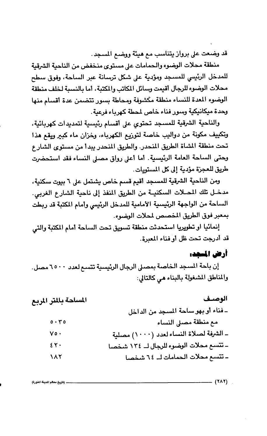 282…وقد وضعت على برواز يتناسب مع هيئة ووضع المسجد. منطقة محلات الوضوء والحمامات على مستوى منخفض من الناحية الشرقية للمدخل الرئيسي للمسجد ومؤدية على شكل ترسانة عبر الساحة، وفوق سطح محلات الوضوء للرجال أقيمت وسائل المكاتب والمكتبة، أما بالنسبة لخلف منطقة الوضوء المعدة للنساء منطقة مكشوفة ومحاطة بسور تتضمن عدة أقسام منها وحدة ميكانيكية وسور فناء خاص لمحطة كهرباء فرعية. والناحية الشرقية للمسجد تحتوي على أقسام رئيسية لتمديدات كهربائية، وتكييف مكونة من دواليب خاصة لتوزيع الكهرباء، وخزان ماء كبير ويقع هذا تحت منطقة المشاة الطريق المنحدر. والطريق المنحدر يبدأ من مستوى الشارع وحتى الساحة العامة الرئيسية. أما أعلى رواق مصلى النساء فقد استحضرت طريق للعجزة مؤدية إلى كل المستويات. ومن الناحية الشرقية للمسجد أقيم قسم خاص يشتمل على 6 بيوت سكنية، مدخل تلك المحلات السكنية من الطريق المنفذ إلى ناحية الشارع الغربي، الساحة من الواجهة الرئيسية الأمامية للمدخل الرئيسي وأمام المكتبة قد ربطت بمعبر فوق الطريق المخصص لمحلات الوضوء. إنمائياً أو تطويرياً استحدثت منطقة تسويق تحت الساحة أمام المكتبة التي قد أدرجت تحت ظل أو فناء المعبرة.