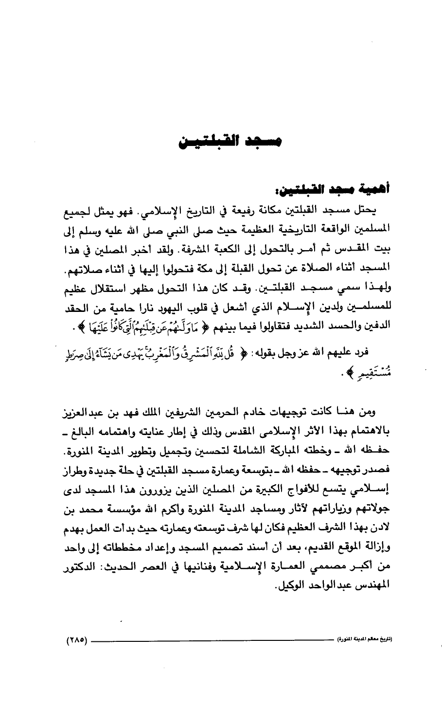 يحتل مسجد القبلتين مكانة رفيعة في التاريخ الإسلامي. فهو يمثل لجميع المسلمين الواقعة التاريخية العظيمة حيث صلى النبي صلى الله عليه وسلم إلى بيت المقدس ثم أمر بالتحول إلى الكعبة المشرفة. ولقد أخبر المصلين في هذا المسجد أثناء الصلاة عن تحول القبلة إلى مكة فتحولوا إليها في أثناء صلاتهم. ولهذا سمي مسجد القبلتين، وقد كان هذا التحول مظهر استقلال عظيم للمسلمين ولدين الإسلام الذي أشعل في قلوب اليهود ناراً حامية من الحقد الدفين والحسد الشديد فتقولوا فيما بينهم (مَاوَلَّاهُم عَن قِبلتِهِمُ التي كانوا عليها). فرد عليهم الله عز وجل بقوله: (قُل لله المَشرقُ والمغرِبُ يهدي من يشاءُ إلى صِراطٍ مُستقيم). ومن هنا كانت توجيهات خادم الحرمين الشريفين الملك فهد بن عبد العزيز بالاهتمام بهذا الأثر الإسلامي المقدس وذلك في إطار عنايته واهتمامه البالغ ـ حفظه الله ـ وخطته المباركة الشاملة لتحسين وتجميل وتطوير المدينة المنورة، فصدر توجيهه ـ حفظه الله ـ بتوسعة وعمارة مسجد القبلتين في حلة جديدة وطراز إسلامي يتسع للأفواج الكبيرة من المصلين الذين يزورون هذا المسجد لدى جولاتهم وزياراتهم لآثار ومساجد المدينة المنورة وأكرم الله مؤسسة محمد بن لادن بهذا الشرف العظيم فكان لها شرف توسعته وعمارته حيث بدأت العمل بهدم وإزالة الموقع القديم، بعد أن أسند تصميم المسجد وإعداد مخططاته إلى واحد من أكبر مصممي العمارة الإسلامية وفنانيها في العصر الحديث: الدكتور المهندس عبد الواحد الوكيل.…