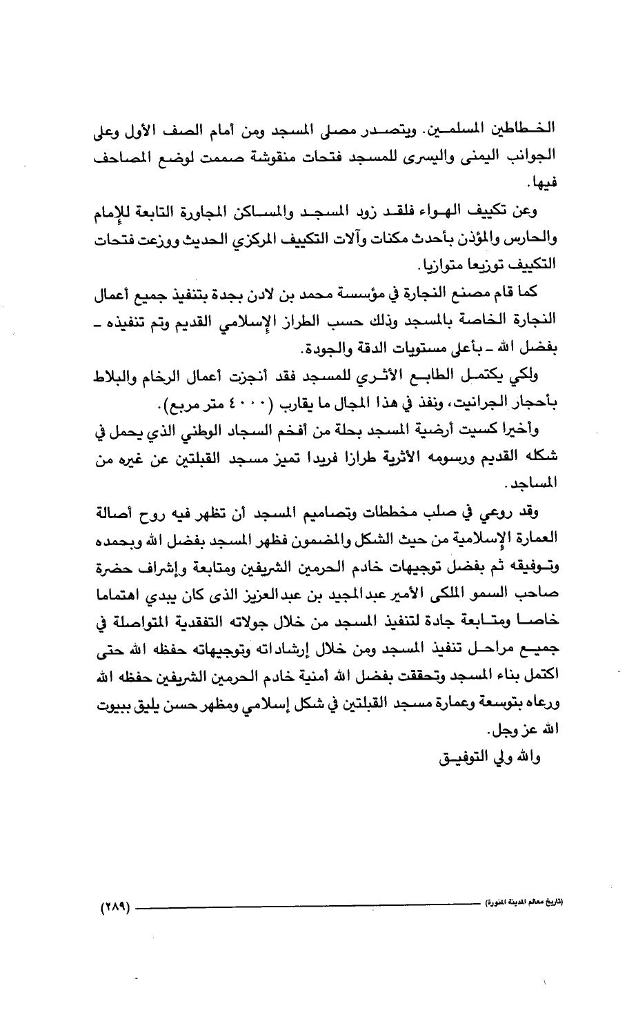 وقد روعي في صلب مخططات وتصاميم المسجد أن تظهر فيه روح أصالة العمارة الإسلامية من حيث الشكل والمضمون فظهر المسجد بفضل الله وبحمده وتوفيقه ثم بفضل توجيهات خادم الحرمين الشريفين ومتابعة وإشراف حضرة صاحب السمو الملكي الأمير عبد المجيد بن عبد العزيز الذي كان يبدي اهتماماً خاصاً ومتابعة جادة لتنفيذ المسجد من خلال جولاته التفقدية المتواصلة في جميع مراحل تنفيذ المسجد ومن خلال إرشاداته وتوجيهاته حفظه الله حتى اكتمل بناء المسجد وتحققت بفضل الله أمنية خادم الحرمين الشريفين حفظه اللخه ورعاه بتوسعة وعمارة مسجد القبلتين في شكل إسلامي ومظهر حسن يليق ببيوت الله عز وجل.