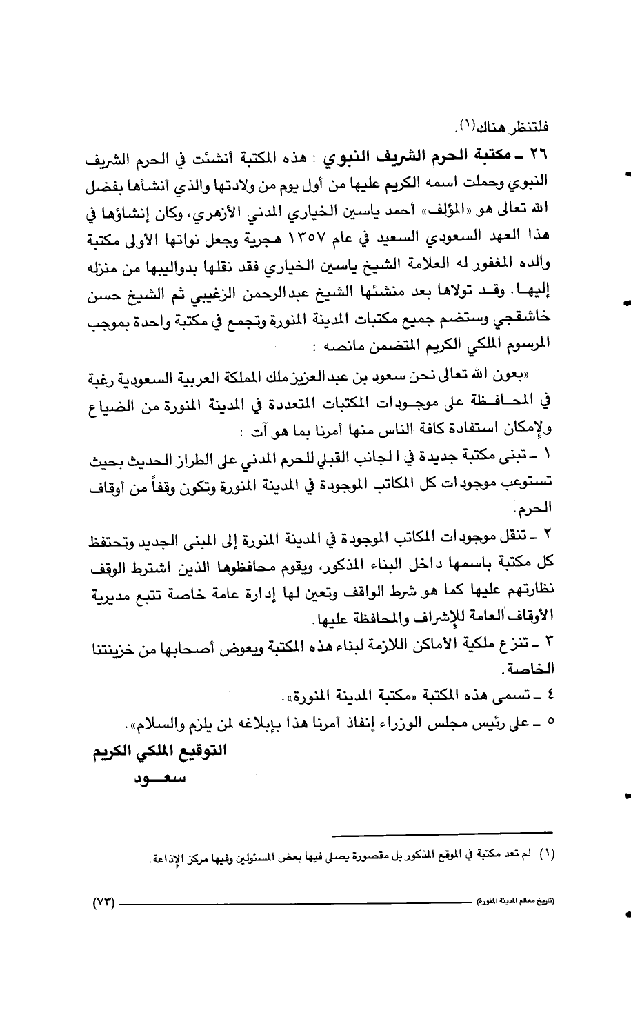 26 - مكتبة الحرم الشريف النبوي: هذه المكتبة أنشئت في الحرم الشريف النبوي وحملت اسمه الكريم عليها من أول يوم من ولادتها والذي أنشأها بفضل الله تعالى هو " المؤلف " أحمد ياسين الخياري المدني الأزهري. وكان إنشاؤها في هذا العهد السعودي السعيد في عام 1357 هجرية وجعل نواتها الأولى مكتبة والده المغفور له العلامة الشيخ ياسين الخياري فقد نقلها بدواليبها من منزله إليها. وقد تولاها بعد منشئها الشيخ عبد الرحمن الزغيبي ثم الشيخ حسن خاشقجي وستضم جميع مكتبات المدينة المنورة وتجمع في مكتبة واحدة بموجب المرسوم الملكي الكريم المتضمن ما نصه: " بعون الله تعالى نحن سعود بن عبد العزيز ملك المملكة العربية السعودية رغبة في المحافظة على موجودات المكتبات المتعددة في المدينة المنورة من الضياع ولإمكان استفادة كافة الناس منها أمرنا بما هو آت.