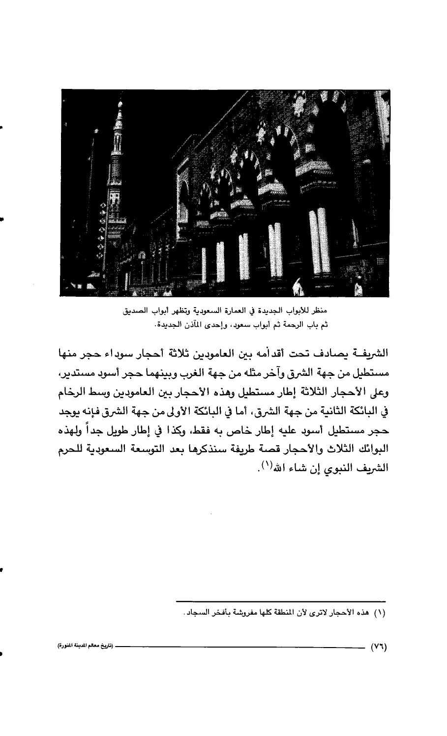 منظر للأبواب الجديدة في العمارة السعودية وتظهر أبواب الصديق ثم باب الرحمة ثم أبواب سعود، وإحدى المآذن الجديدة الشريفة يصادف تحت أقدامه بين العاموين ثلاثة أحجار سوداء حجر منها مستطيل من جهة الشرق وآخر مثله من جهة الغرب وبينهما حجر أسود مستدير، وعلى الأحجار الثلاثة إطار مستطيل وهذه الأحجار بين العامودين وسط الرخام في البائكة الثانية من جهة الشرق، أما في البائكة الأولى من جهة الشرق فإنه يوجد حجر مستطيل أسود عليه إطار خاص به فقط، وكذا في إطار طويل جداً ولهذه البوائك الثلاث والأحجار قصة طريفة سنذكرها بعد التوسعة السعودية للحرم الشريف النبوي إن شاء الله (1).…