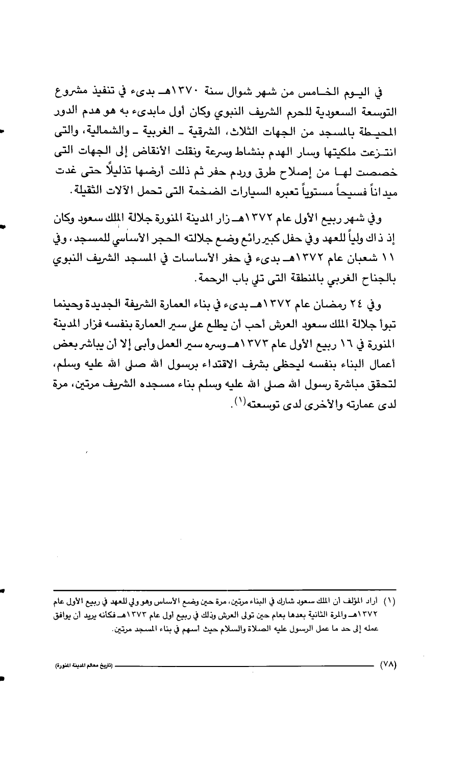 (1) أراد المؤلف أن الملك سعود شارك في البناء مرتين، مرة حين وضع الأساس وهو ولي للعهد في ربيع الأول عام 1372 هـ والمرة الثانية بعدها بعام حين تولى العرش وذلك في ربيع أول عام 1373 هـ فكأنه يريد أن يوافق عمله إلى حد ما عمل الرسول عليه الصلاة والسلام حيث أسهم في بناء المسجد مرتين.