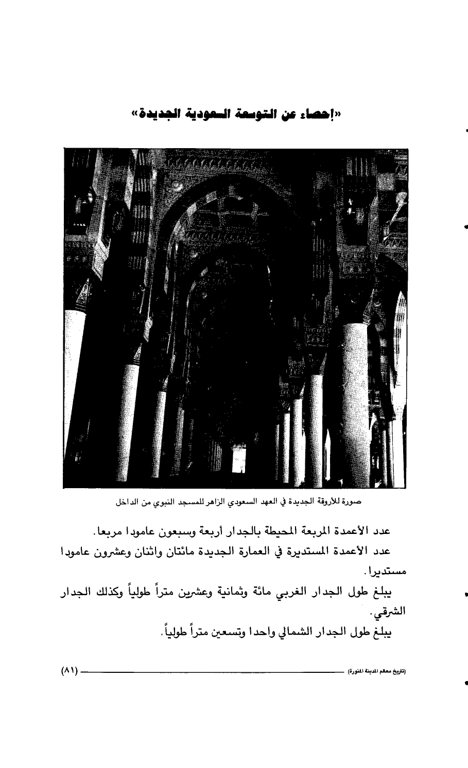 صورة للأروقة الجديدة في العهد السعودي الزاهر للمسجد النبوي من الداخل عدد الأعمدة المربعة المحيطة بالجدار أربعة وسبعون عاموداً مربعاً. عدد الأعمدة المستديرة في العمارة الجديدة مائتان واثنان وعشرون عاموداً مستديراً.