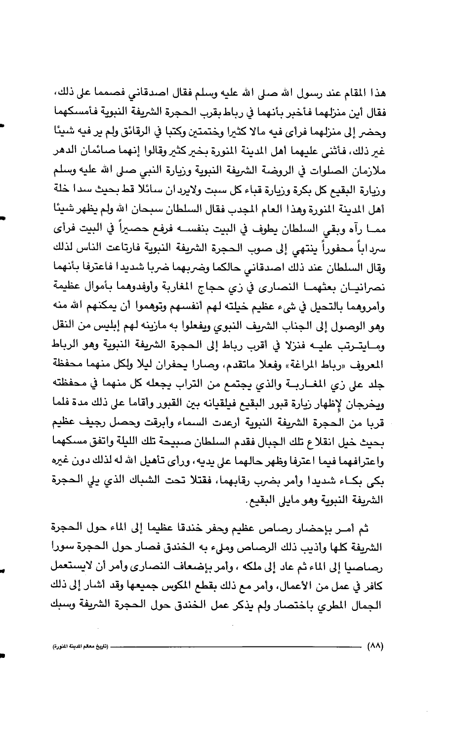 88…هذا المقام عند رسول الله صلى الله عليه وسلم فقال أصدقاني فصمما على ذلك، فقال أين منزلهما فأخبر بأنهما في رباط بقرب الحجرة الشريفة النبوية فأمسكهما وحضر إلى منزلهما فرأى فيه مالاً كثيراً وختمتين وكتبا في الرقاق ولم ير فيه شيئاً غير ذلك، فأثنى عليهما أهل المدينة المنورة بخير كثير وقالوا إنهما صائمان الدهر ملازمان الصلوات في الروضة الشريفة النبوية وزيارة النبي صلى الله عليه وسلم وزيارة البقيع وزيارة قباء كل سبت ولا يردان سائلاً قط بحيث سدا خلة أهل المدينة المنورة وهذا العام المجدب فقال السلطان سبحان الله ولم يظهر شيئاً مما رآه وبقي السلطان يطوف في البيت نفسه فرفع حصيراً في البيت فرآى سرداباً محفوراً ينتهي إلى صوب الحجرة الشريفة النبوية فارتاعت الناس لذلك وقال السلطان عند ذلك أصدقاني حالكما وضربهما ضرباً شديداً فاعترفا بأنهما نصرانيان بعثهما النصارى في زي حجاج المغاربة وأوفدوهما بأموال عظيمة وأمروهما بالتحيل في شيء عظيم خيلته لهم أنفسهم وتوهموا أن يمكنهم الله منه وهو الوصول إلى الجناب الشريف النبوي ويفعلوا به مازينه لهم إبليس من النقل وما يترتب عليه فنزلا في أقرب رباط إلى الحجرة الشريفة النبوية وهو الرباط المعروف " رباط المراغة" وفعلا ما تقدم، وصارا يحفران ليلاً ولكل منهما محفظة جلد على زي المغاربة والذي بجتمع من التراب يجعله كل منهما في محفظته ويخرجان لإظهار زيارة قبور البقيع فيلقيانه بين القبور وأقاما على ذلك مدة فلما قربا من الحجرة الشريفة النبوية أرعدت السماء وأبرقت وحصل رجيف عظيم بحيث خيل انقلاع تلك الجبال فقدم السلطان صبيحة تلك الليلة واتفق مسكهما واعترافهما فيما اعترفا وظهر حالهما على يديه، ورأى تأهيل الله له لذلك دون غيره بكى بكاءً شديداً وأمر بضرب رقابهما، فقتلا تحت الشباك الذي يلي الحجرة الشريفة النبوية وهو ما يلي البقيع. ثم أمر بإحضار رصاص عظيم وحفر خندقاً عظيماً إلى الماء حول الحجرة الشريفة كلها وأذيب ذلك الرصاص وملئ به الخندق فصار حول الحجرة سوراً رصاصياً إلى الماء ثم عاد إلى ملكه، وأمر بإضعاف النصارى وأمر أن لايستعمل كافر في عمل من الأعمال، وأمر مع ذلك بقطع المكوس جميعها وقد أشار إلى ذلك الجمال المطري باختصار ولم يذكر عمل الخندق حول الحجرة الشريفة وسبك…