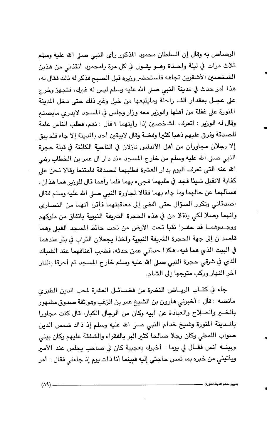 89…الرصاص به وقال إن السلطان محمود المذكور رأى النبي صلى الله عليه وسلم ثلاث مرات في ليلة واحدة وهو يقول في كل مرة يا محمود أنقذني من هذين الشخصين الأشقرين تجاهه فاستحضر وزيره قبل الصبح فذكر له ذلك فقال له، هذا أمر حدث في مدينة النبي صلى الله عليه وسلم ليس له غيرك حتى دخل المدينة المنورة على غفلة من أهلها والوزير معه وزار وجلس في المسجد لا يدري ما يصنع وقال له الوزير: أتعرف الشخصين إذا رأيتهما؟ قال: نعم فطلب الناس عامة للصدقة وفرق عليهم ذهباً كثيراً وفضة وقال لايبقين أحد بالمدينة إلا جاء فلم يبق إلا رجلان مجاوران من أهل الأندلس نازلان في الناحية الكائنة في قبلة حجرة النبي صلى الله عليه وسلم من خارج المسجد عند دار آل عمر بن الخطاب رضي الله عنه التي تعرف اليوم بدار العشرة فطلبهما للصدقة فامتنعا وقالا نحن على كفاية لا نقبل شيئاً فجد في طلبهما فجيء بهما فلما رآهما قال للوزير هما هذان، فسالهما عن حالهما وما جاء بهما فقالا لمجاورة النبي صلى الله عليه وسلم فقال أصدقاني وتكرر السؤال حتى أفضى إلى معاقبتهما فأقرا أنهما من النصارى وأنهما وصلا لكي ينقلا من في هذه الحجرة الشريفة النبوية باتفاق من ملوكهم ووجدوهما قد حفرا نقبا تحت الأرض من تحت حائط المسجد القبلي وهما قاصدان إلى جهة الحجرة الشريفة النبوية وأخذا يجعلان التراب في بئر عندهما في البيت الذي هما فيه، هكذا حدثني عمن حدثه، فضرب أعناقهما عند الشباك الذي في شرقي حجرة النبي صلى الله عليه وسلم خارج المسجد ثم أحرقا بالنار آخر النهار وركب متوجهاً إلى الشام. جاء في كتاب الرياض النضرة فن فضائل العشرة لمحب الدين الطبري ما نصه: قال: أخبرني هارون بن الشيخ عمر بن الزغب وهو ثقة صدوق مشهور بالخير والصلاح والعبادة عن أبيه وكان من الرجال الكبار، قال كنت مجاوراً بالمدينة المنورة وشيخ خدام النبي صلى الله عليه وسلم إذ ذاك شمس الدين صواب اللمطي وكان رجلاً صالحاً كثير البر يالفقراء والشفقة عليهم وكان بيني وبينه أنس فقال لي يوماً: أخبرني بعجيبة كان لي صاحب يجلس عند الأمير ويأتيني من خبره بما تمس حاجتي إليه فبينما أنا ذات يوم إذ جاءني فقال: أمر…