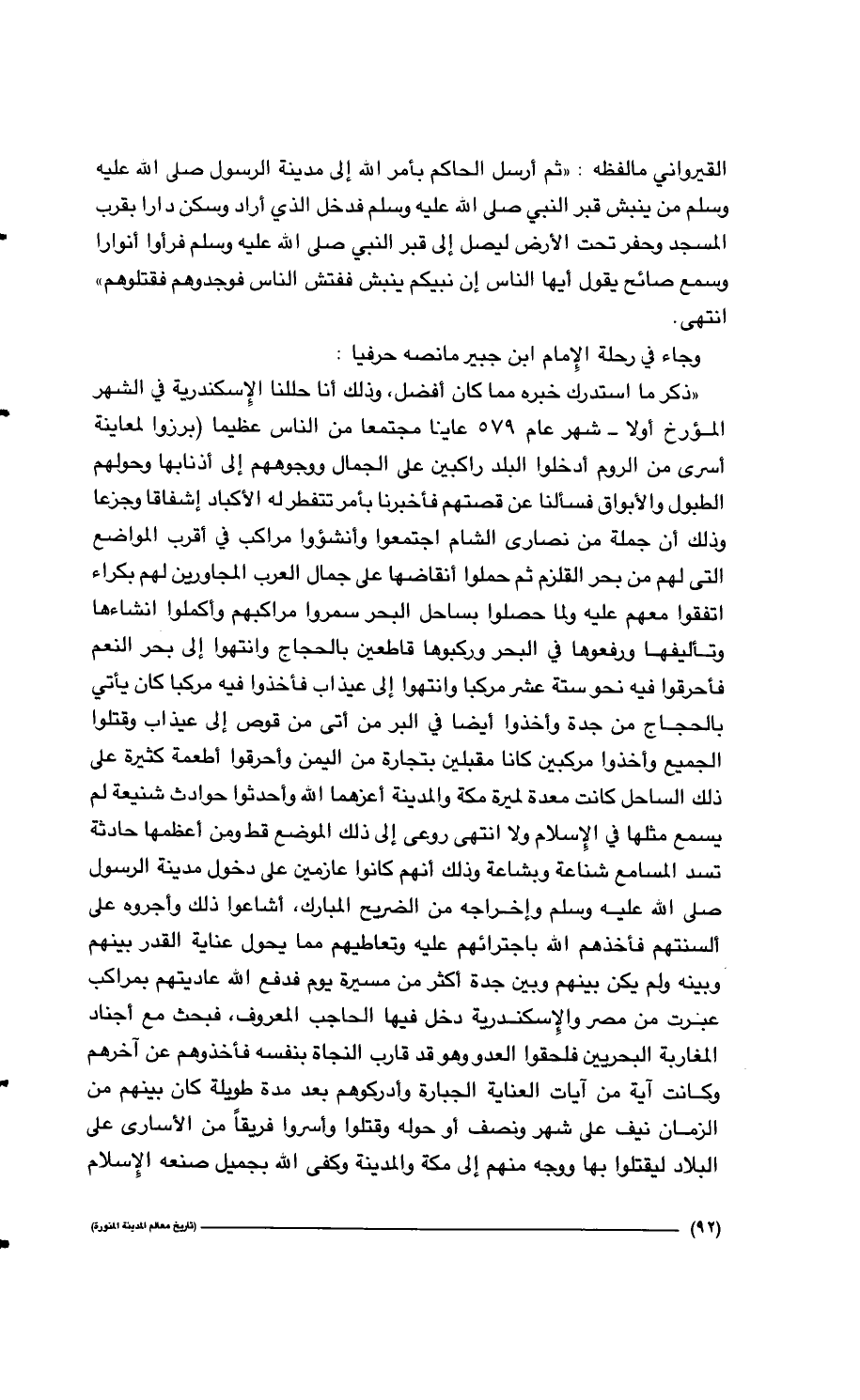 92…القيرواني مالفظه:" ثم أرسل الحاكم بأمر الله إلى مدينة الرسول صلى الله عليه وسلم من ينبش قبر النبي صلى الله عليه وسلم فدخل الذي أراد وسكن داراً بقرب المسجد وحفر تحت الأرض ليصل إلى قبر النبي صلى الله عليه وسلم فرأوا أنواراً وسمع صائح يقول أيها الناس إن نبيكم ينبش ففتش الناس فوجدوهم فقتلوهم " انتهى. وجاء في رحلة الإمام ابن جبير ما نصه حرفياً: " ذكر ما استدرك خبره مما كان أفضل، وذلك أنا حللنا الإسكندرية في الشهر المؤرخ أولاً ـ شهر عام 579 عاينا مجتمعاً من الناس عظيماً (برزوا لمعاينة أسرى من الروم أدخلوا البلد راكبين على الجمال ووجوههم إلى أذنابها وحولهم الطبول والبواق فسألناهم عن قصتهم فأخبرنا بأمر تتفطر له الأكباد إشفاقاً وجزعاً وذلك أن جملة من نصارى الشام اجتمعوا وأنشؤوا مراكب في أقرب المواضع التي لهم من بحر القلزم ثم حملوا أنقاضها على جمال العرب المجاورين لهم بكراء اتفقوا معهم عليه ولما حملوا بساحل البحر سمروا مراكبهم وأكملوا 'نشاءها وتأليفها ورفعوها في البحر وركبوها قاطعين بالحجاج وانهوا إلى بحر النعم فأحرقوا فيه نحو ستة عشر مركباً وانتهوا إلى عيذاب فأخذوا فيه مركباً كان يأتي بالحجاج وأخذوا أيضاً في البر من أتى من قوص إلى عيذاب وقتلوا الجميع وأخذوا مركبين كانا مقبلين بتجارة من اليمن وأحرقوا أطعمة كثيرة على ذلك الساحل كانت معدة لميرة مكة والمدينة أعزهما الله وأحدثوا حوادث شنيعة لم يسمع مثلها في الإسلام ولا انتهى روعي إلى ذلك الموضع قط ومن أعظمها حادثة تسد المسامع شناعة وبشاعة وذلك أنهم كانوا عازمين على دخول مدينة الرسول صلى الله عليه وسلم وإخراجه من الضريح المبارك، وأشاعوا ذلك وأجروه على ألسنتهم فأخذهم الله باجترائهم عليه وتعاطيهم مما يحول عناية القدر بينهما وبينه ولم يكن بينهم وبين جدة أكثر من مسيرة يوم فدفع الله عاديتهم بمراكب عبرت من مصر والإسكندرية دخل فيها الحاجب المعروف، فبحث مع أجناد المغاربة البحريين فلحقوا العدو وهو قد قارب النجاة بنفسه فأخذوهم عن آخرهم وكانت آية من آيات العناية الجبارة وأدركوهم بعد مدة طويلة كان بينهم من الزمان نيف على شهر ونصف أو حوله وقتلوا وأسروا فريقاً من الأسارى على البلاد ليقتلوا بها ووجه منهم إلى مكة والمدينة وكفى الله بجميل صنعه الإسلام…