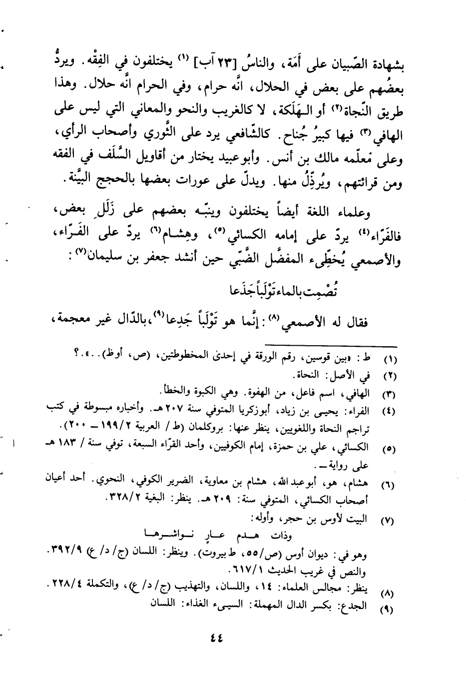 بشهادة الصّبيان على أَمَة، والناسُ [23 آب] (¬1) يختلفون في الفِقْه. ويردُّ بعضُهم على بعض في الحلال، انَّه حرام، وفي الحرام انَّه حلال. وهذا طريق النّجاة (¬2) أو الهَلَكة، لا كالغريب والنحو والمعاني التي ليس على الهافي (¬3) فيها كبيرُ جُناح. كالشّافعي يرد على الثَّوري وأصحاب الرأي، وعلى مُعلّمه مالك بن أنس. وأبو عبيد يختار من أقاويل السَّلَف في الفقه ومن قرائتهم، ويُرذِّلُ منها. ويدلّ على عورات بعضها بالحجج البيَّنة.