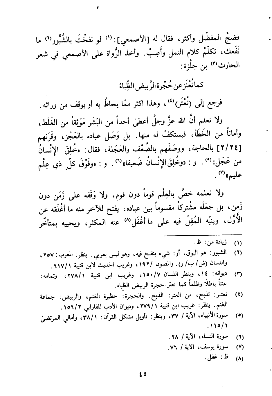 فضجَّ المفضّل وأكثر، فقال له [الأصمعي]: (¬1) لو نفخْتَ بالشَّبُّور (¬2) ما نَفَعك، تكلّمْ كلام النمل وأَصِبْ. وأخذ الرُّواة على الأصمعي في شعر الحارث (¬3) بن حِلَّزة: