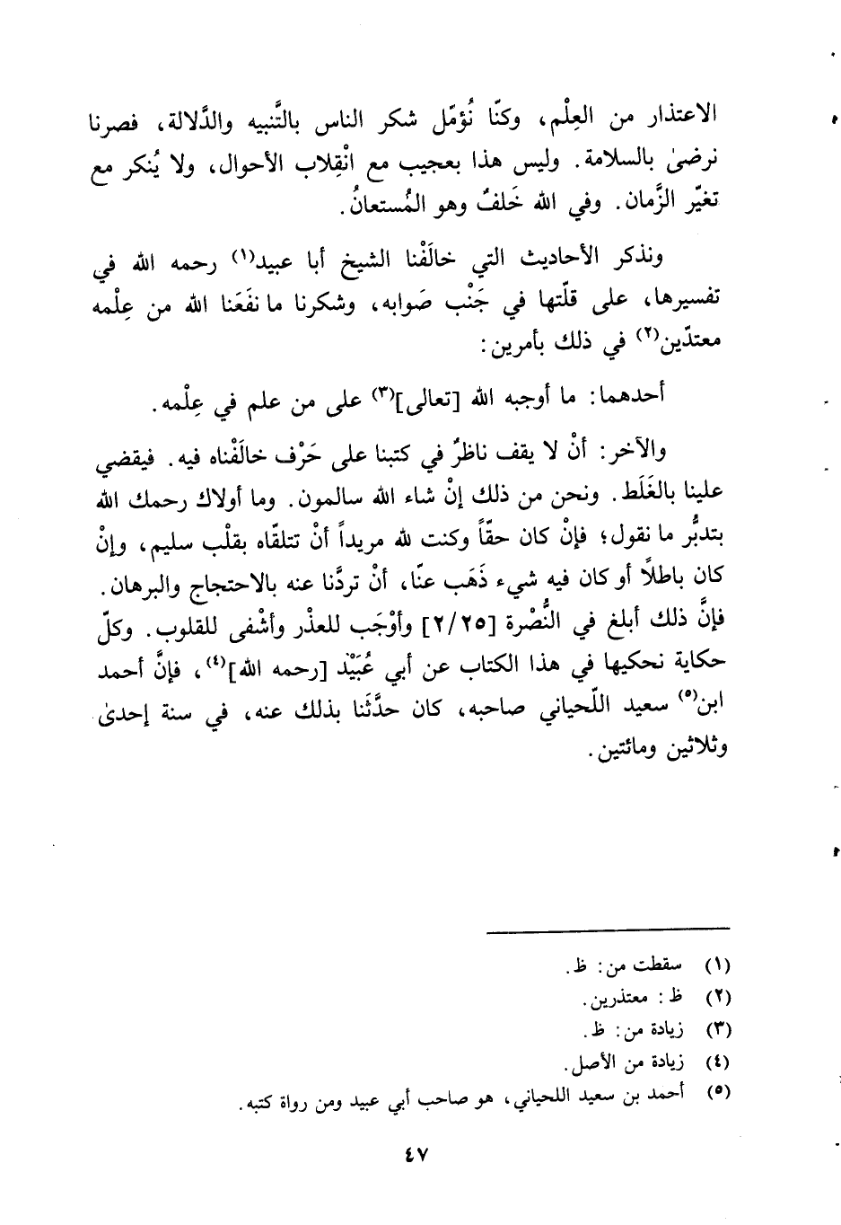والآخر: أنْ لا يقف ناظر في كتبنا على حَرْف خالَفْناه فيه. فيقضي علينا بالغَلَط. ونحن من ذلك إنْ شاء الله سالمون. وما أولاك رحمك الله بتدبُّر ما نقول؛ فإنْ كان حقّاً وكنت لله مريداً أن تتلقّاه بقلْب سليم، وإنْ كانِ باطلاً أو كان فيه شيء ذَهب عنّا، أنْ تردَّنا عنه بالاحتجاج والبرهان. فإنَّ ذلك أبلغ في النُّصْرة [2/ 25]، وأوْجَب للعذْر وأشْفى للقلوب. وكلّ حكاية نحكيها في هذا الكتاب عن أبي عبيد [-رحمه الله-] (¬4)، فإنَّ أحمد ابن (¬5) سعيد اللّحياني صاحبه، كان حدَّثَنا بذلك عنه، في سنة إحدى. وثلاثين ومائتين.