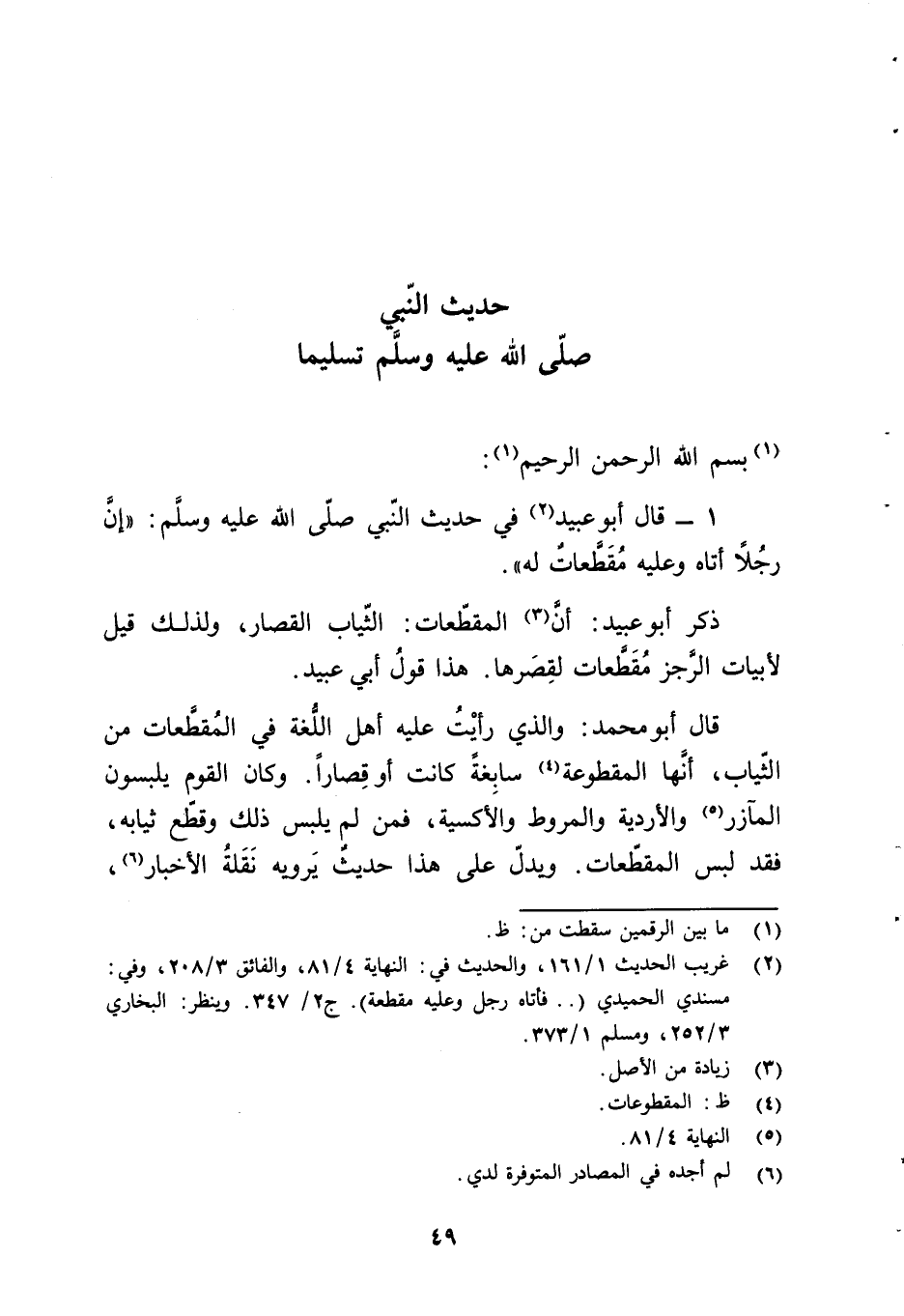 1 - قال أبو عبيد (¬2) في حديث النّبي - صلّى الله عليه وسلَّم -: "إنَّ رجُلاً أتاه وعليه مُقَطَّعاتٌ له".