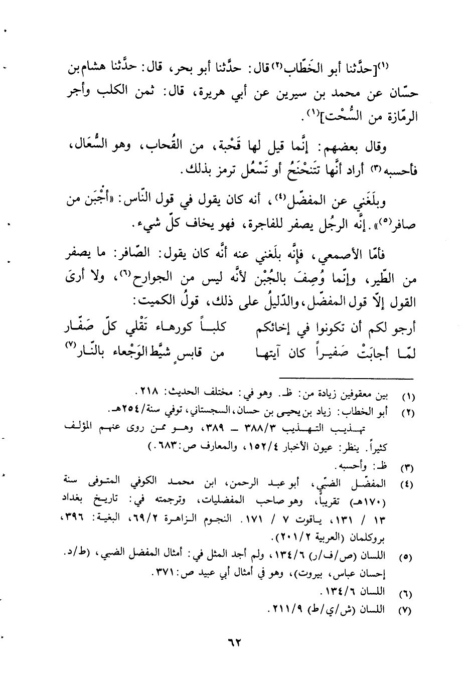 (¬4) المفضل الضبّي، أبو عبد الرحمن، ابن محمد الكوفي المتوفى سنة (170 هـ) تقريبًا، وهو صاحب المفضليات، وترجمته في: تاريخ بغداد 13/ 131، ياقوت 7/ 171. النجوم الزاهرة 2/ 69، البغية: 396، بروكلمان (العربية 2/ 201).