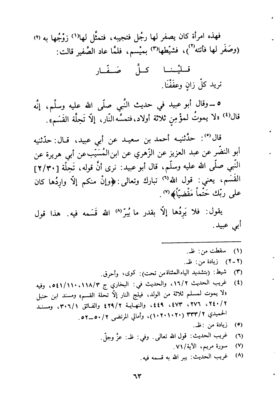 (¬4) غريب الحديث 2/ 16، والحديث في: البخاري ج 3/ 118، 110/ 541، وفيه "لا يموت لمسلم ثلاثة من الولد، فيلج النار إلّا تحلة القسم" ومسند ابن حنبل 2/ 240، 276، 473، 449، والنهاية 2/ 429 والفائق 1/ 306، ومسند الحميدي 2/ 333 (10201020)، وأمالي المرتضى 2/ 50 - 52.