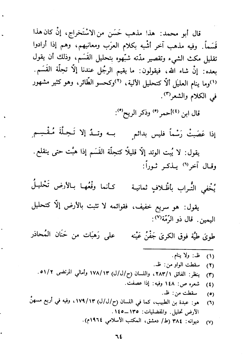 (¬6) هو: عبدة بن الطبيب، كما في اللسان (ح/ ل/ ل) 13/ 179، وفيه في أربع مسهنَّ الأرض تحليل. والمفضليات: 135 - 145.