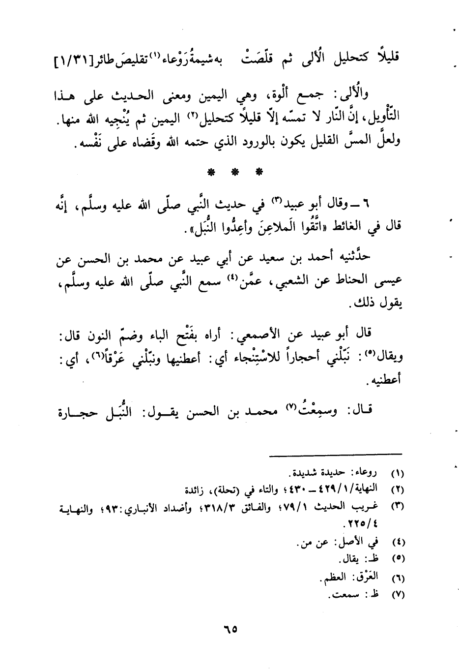 6 - وقال أبو عبيد (¬3) في حديث النَّبي - صلّى الله عليه وسلَّم -، إنَّه قال في الغائط "اتَّقُوا الَملاعِنَ وأعِدُّوا النُّبَل".