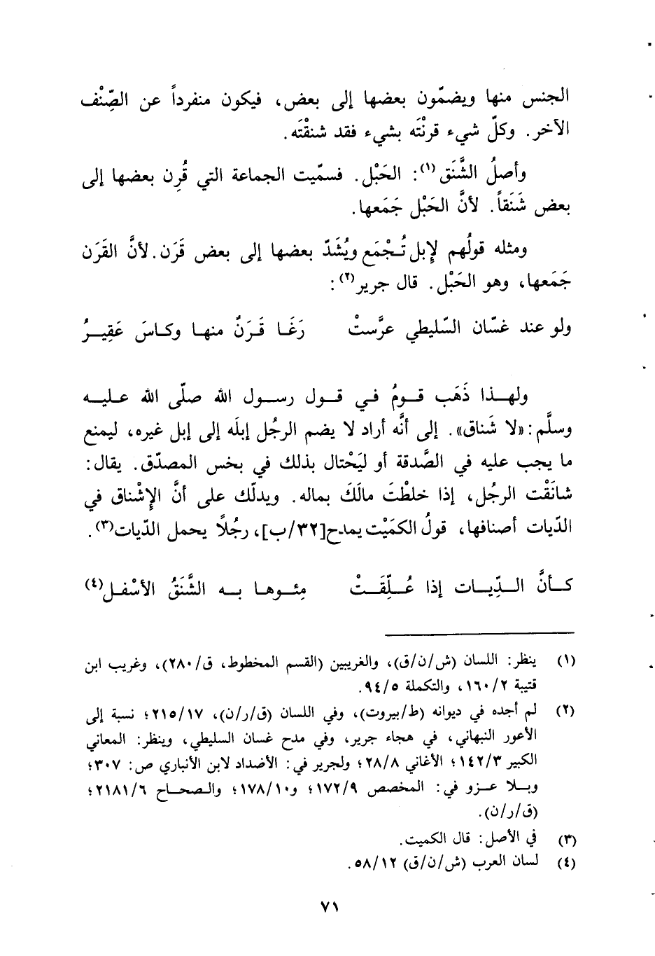 ولهذا ذَهَب قومُ في قول رسول الله - صلّى الله عليه وسلَّم -: "لا شَناق". إلى أنَّه أراد لا يضم الرجُل إبلَه إلى إبل غيره، ليمنع ما يجب عليه في الصَّدقة أو ليَحْتال بذلك في بخس المصدّق. يقال: شانَقْت الرجُل، إذا خلطْتَ مالَكَ بماله. ويدّلك على أنَّ الإِشْناق في الدّيات أصنافها، قولُ الكمَيْت يمدح، رجُلًا يحمل الدّيات (¬3).