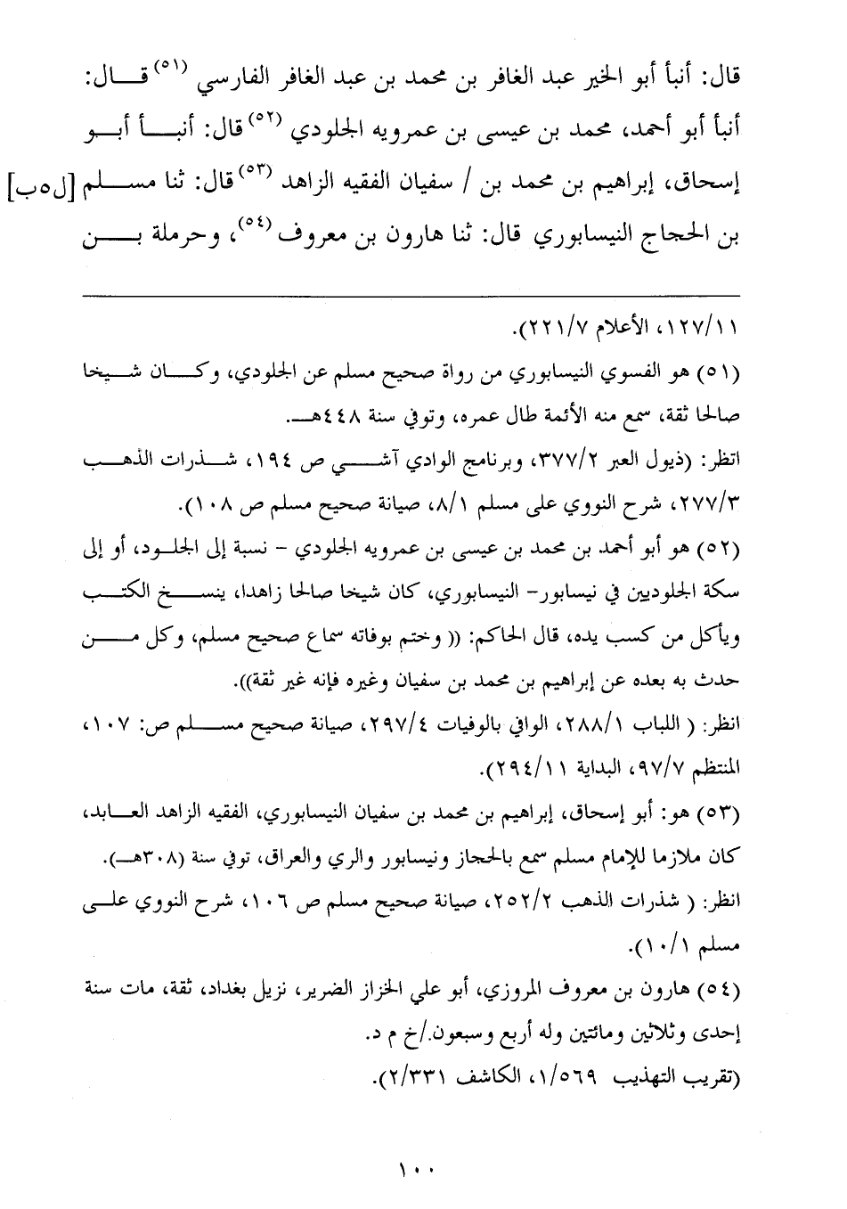 قَالَ: أنبأ أَبُو الْخَيْرِ عَبْدُ الْغَافِرِ بْنُ مُحَمَّدِ بْنِ عَبْدِ الْغَافِرِ الْفَارِسِيُّ، قَالَ: أنبأ أَبُو أَحْمَدَ مُحَمَّدُ بْنُ عِيسَى بْنِ عَمْرَوَيْهِ الْجُلُودِيُّ، قَالَ: أنبأ أَبُو إِسْحَاقَ إِبْرَاهِيمُ بْنُ مُحَمَّدِ بْنِ سُفْيَانَ الْفَقِيهُ الزَّاهِدُ، قَالَ: ثنا مُسْلِمُ بْنُ الْحَجَّاجِ النَّيْسَابُورِيُّ، قَالَ: ثنا هَارُونُ بْنُ مَعْرُوفٍ، وَحَرْمَلَةُ بْنُ