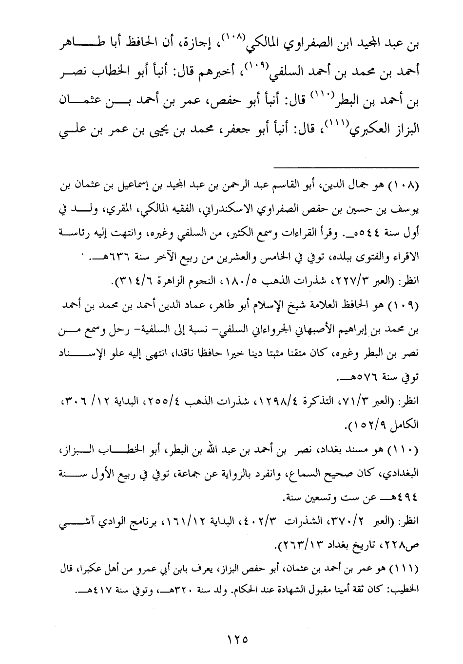 بْنُ عَبْدِ الْمَجِيدِ بْنِ الصفرَاوِيِّ الْمَالِكِيُّ، إِجَازَةً، أَنَّ الْحَافِظَ أَبَا طَاهِرٍ أَحْمَدَ بْنَ مُحَمَّدِ بْنِ أَحْمَدَ السِّلَفِيَّ أَخْبَرَهُمْ، قَالَ: أَنْبَأَ أَبُو الْخَطَّابِ نَصْرُ بْنُ أَحْمَدَ بْنِ الْبَطِرِ، قَالَ: أَنْبَأَ أَبُو حَفْصٍ عُمَرُ بْنُ أَحْمَدَ بْنِ عُثْمَانَ الْبَزَّازُ الْعُكْبَرِيُّ، قَالَ: أَنْبَأَ أَبُو جَعْفَرٍ مُحَمَّدُ بْنُ يَحْيَى بْنِ عُمَرَ بْنِ عَلِيِّ