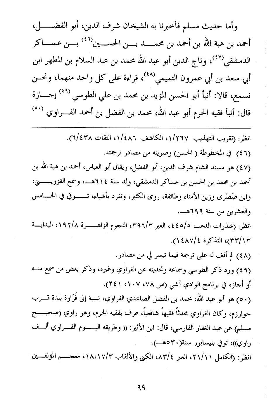 وَأَمَّا حَدِيثُ مُسْلِمٍ، فَأَخْبَرَنَا بِهِ الشَّيْخَانِ شَرَفُ الدِّينِ أَبُو الْفَضْلِ أَحْمَدُ بْنُ هِبَةِ اللَّهِ بْنِ أَحْمَدَ بْنِ مُحَمَّدِ بْنِ الْحُسَيْنِ بْنِ عَسَاكِرَ الدِّمَشْقِيُّ، وَتَاجُ الدِّينِ أَبُو عَبْدِ اللَّهِ مُحَمَّدُ بْنُ عَبْدِ السَّلامِ بْنِ الْمُطَهَّرِ بْنِ أَبِي سَعْدِ بْنِ أَبِي عَمْرُونَ التَّمِيمِيُّ، قِرَاءَةً عَلَى كُلِّ وَاحِدٍ مِنْهُمَا، وَنَحْنُ نَسْمَعُ، قَالا: أنبأ أَبُو الْحَسَنِ الْمُؤَيَّدُ بْنُ مُحَمَّدِ بْنِ عَلِيٍّ الطُّوسِيُّ، إِجَازَةً، قَالَ: أَنْبَأَ فَقِيهُ الْحَرَمِ أَبُو عَبْدِ اللَّهِ مُحَمَّدُ بْنُ الْمُفَضَّلِ بْنِ أَحْمَدَ الْفُرَاوِيُّ،