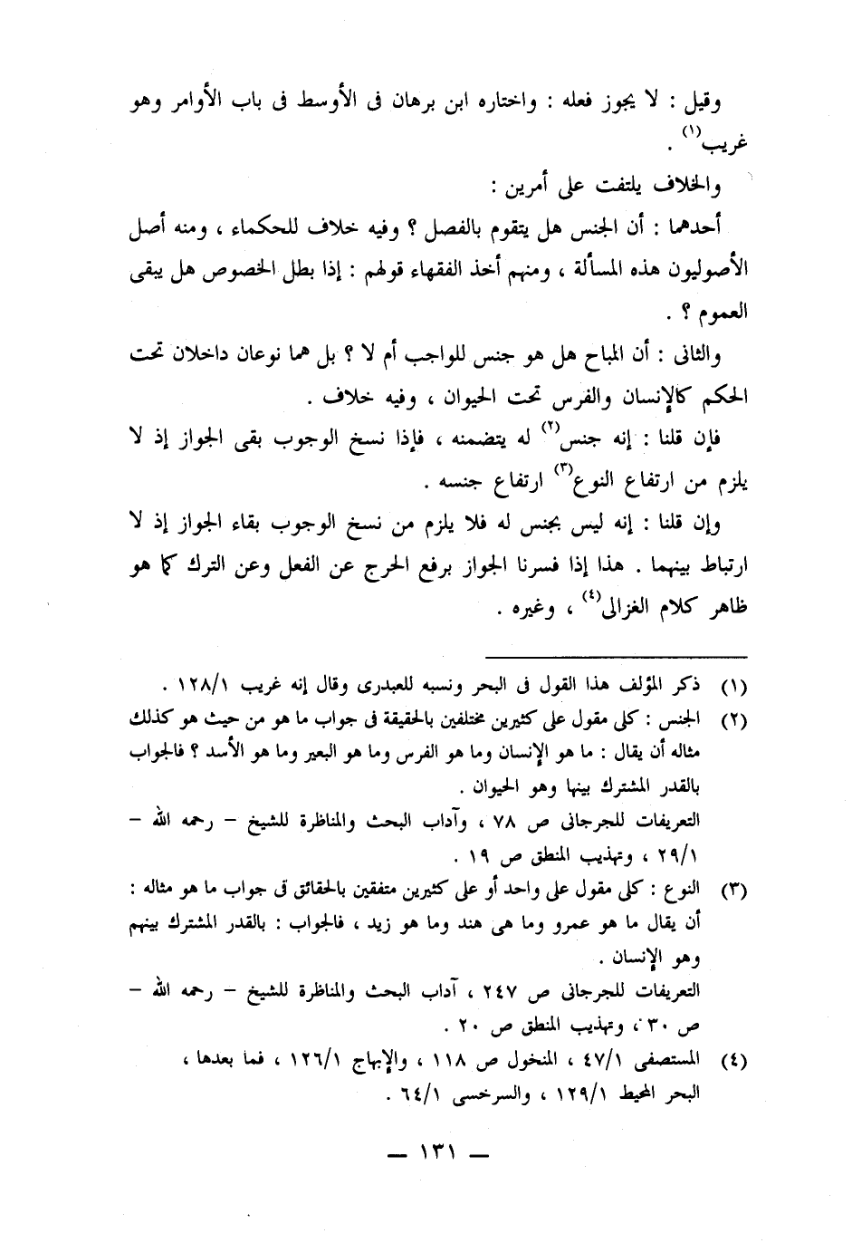 أحدهما: أن الجنس هل يتقوم بالفصل؟ وفيه خلاف للحكماء، ومنه أصل الأصوليون هذه المسألة، ومنهم أخذ الفقهاء قولهم: إذا بطل الخصوص هل يبقى العموم؟ .