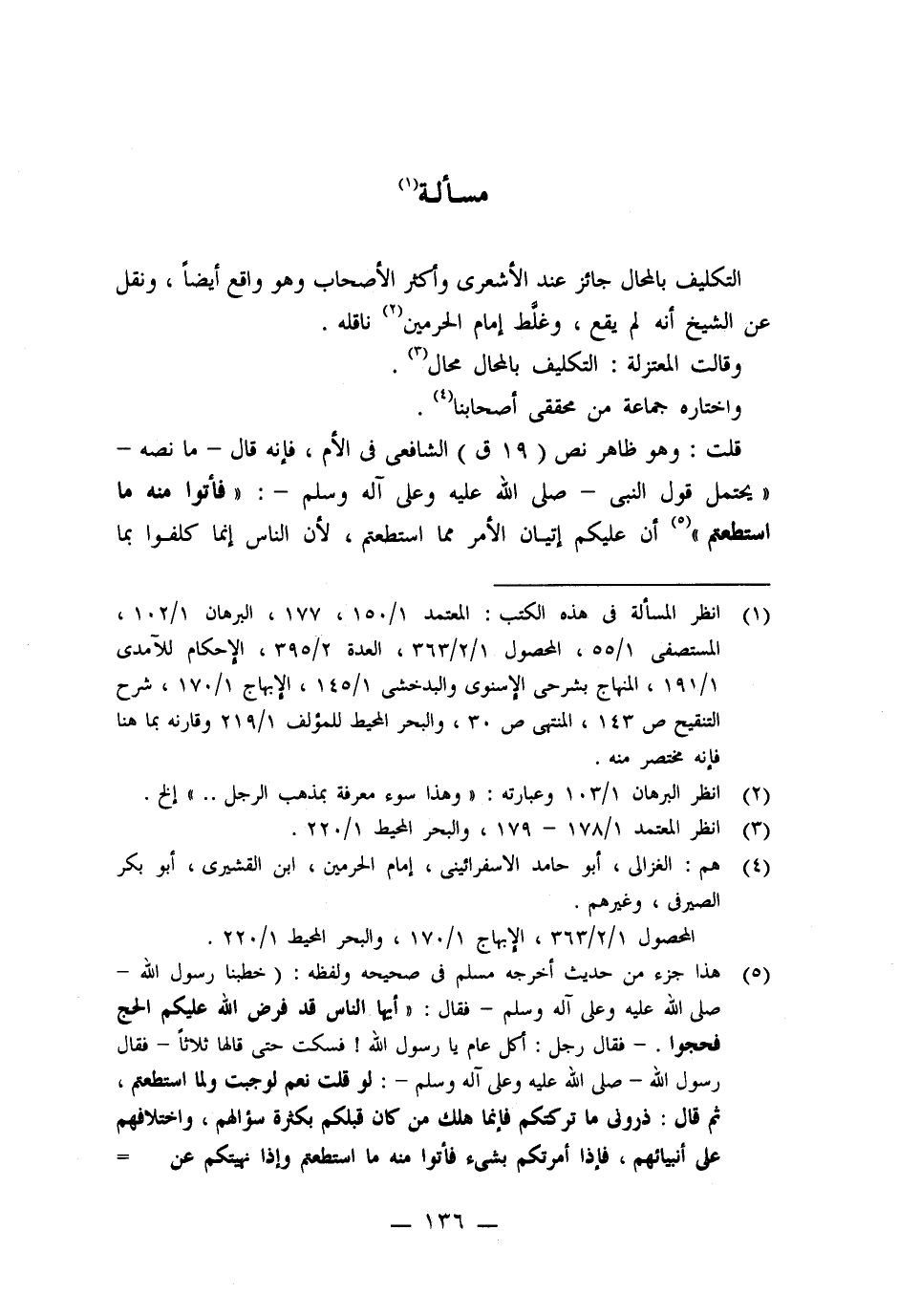 (١) انظر المسألة فى هذه الكتب: المعتمد ١/ ١٥٠، ١٧٧، البرهان ١/ ١٠٢، المستصفى ١/ ٥٥، المحصول ١/ ٢/ ٣٦٣، العدة ٢/ ٣٩٥، الإحكام للآمدى ١/ ١٩١، المنهاج بشرحى الإسنوى والبدخشى ١/ ١٤٥، الإبهاج ١/ ١٧٠، شرح التنقيح ص ١٤٣، المنتهى ص ٣٠، والبحر المحيط للمؤلف ١/ ٢١٩ وقارنه بما هنا فإنه مختصر منه.