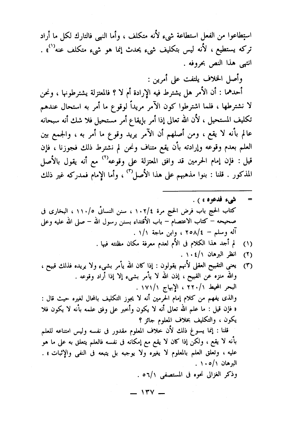 (٣) يعنى التقبيح العقلى لأنهم يقولون: إذا كان اللَّه يأمر بشىء ولا يريده فذلك قبيح، واللَّه منزه عن القبيح، إذن اللَّه لا يأمر بشىء إلا إذا أراد وقوعه.