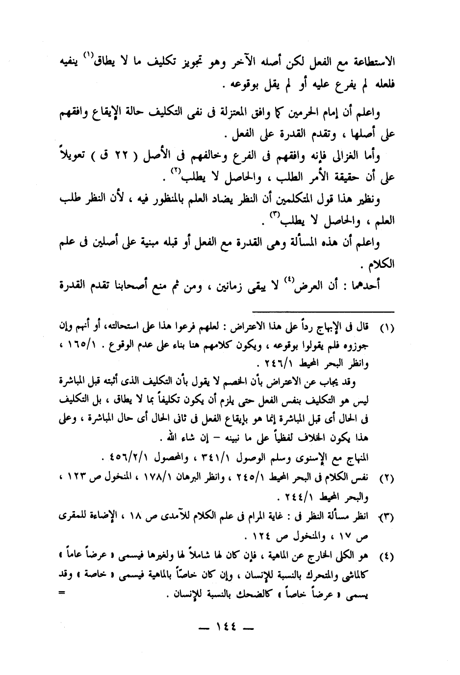 (١) قال فى الإبهاج ردًا على هذا الاعتراض: لعلهم فرعوا هذا على استحالته، أو أنهم وإن جوزوه فلم يقولوا بوقوعه، ويكون كلامهم هنا بناء على عدم الوقوع ١/ ١٦٥، وانظر البحر المحيط ١/ ٢٤٦.