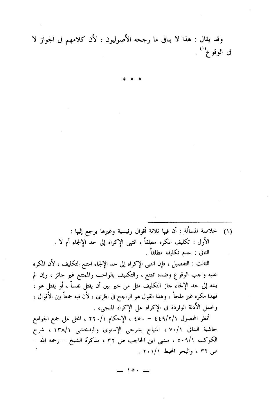 الثالث: التفصيل، فإن انتهى الإكراه إلى حد الإلجاء امتنع التكليف، لأن المكره عليه واجب الوقوع وضده ممتنع، والتكليف بالواجب والممتنع غير جائز، وإن لم ينته إلى حد الإلجاء جاز التكليف مثل من خير بين أن يقتل نفسًا، أو يقتل هو، فهذا مكره غير ملجأ، وهذا القول هو الراجح فى نظرى، لأن فيه جمعًا بين الأقوال، ونحمل الأدلة الواردة فى الإكراه على الإكراه الملجىء.