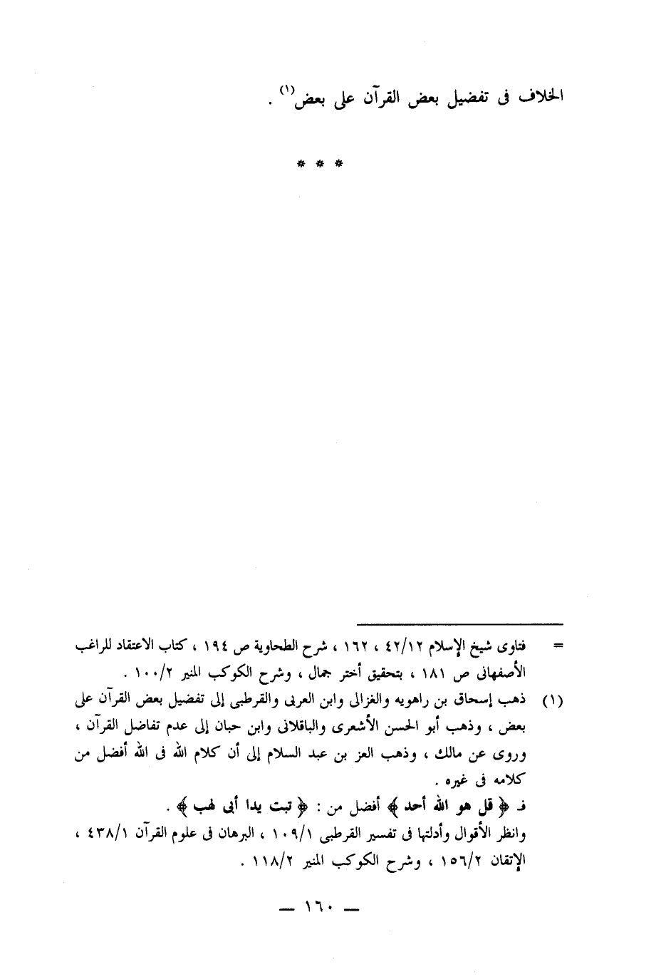 (١) ذهب إسحاق بن راهويه والغزالى وابن العربى والقرطبى إلى تفضيل بعض القرآن على بعض، وذهب أبو الحسن الأشعرى والباقلانى وابن حبان إلى عدم تفاضل القرآن، وروى عن مالك، وذهب العز بن عبد السلام إلى أن كلام اللَّه فى اللَّه أفضل من كلامه فى غيره.