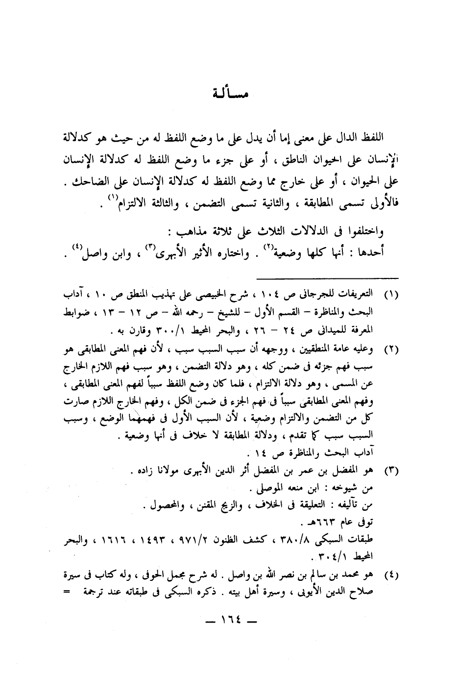 (٢) وعليه عامة المنطقيين، ووجهه أن سبب السبب سبب، لأن فهم المعنى المطابقى هو سبب فهم جزئه فى ضمن كله، وهو دلالة التضمن، وهو سببًا فهم اللازم الخارج عن المسمى، وهو دلالة الالتزام، فلما كان وضع اللفظ سببًا لفهم المعنى المطابقى، وفهم المعنى المطابقى سببًا فى فهم الجزء فى ضمن الكل، وفهم الخارج اللازم صارت كل من التضمن والالتزام وضعية، لأن السبب الأول فى فهمهما الوضع، وسبب السبب سبب كما تقدم، ودلالة المطابقة لا خلاف فى أنها وضعية.