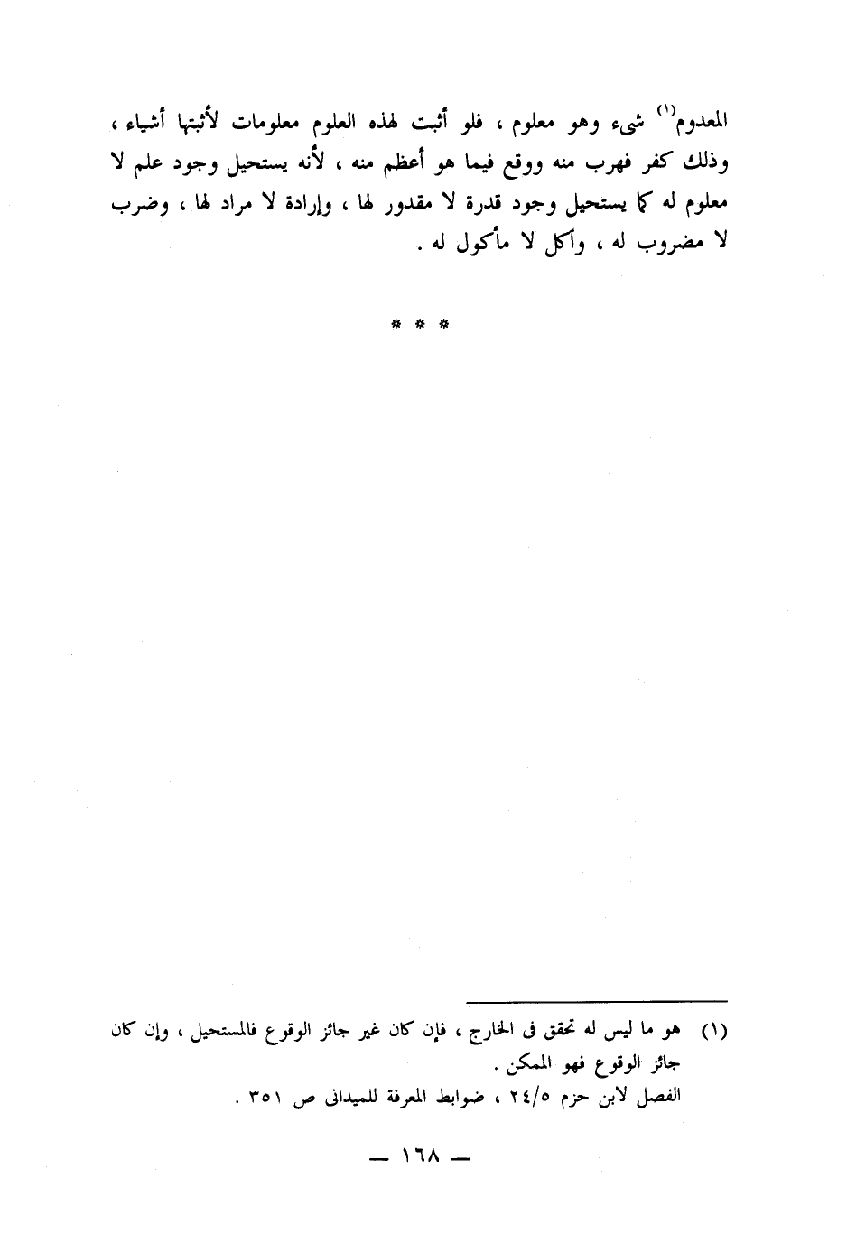 المعدوم (١) شىء وهو معلوم، فلو أثبت لهذه العلوم معلومات لأثبها أشياء، وذلك كفر فهرب منه ووقع فيما هو أعظم منه؛ لأنه يستحيل وجود علم لا معلوم له كما يستحيل وجود قدرة لا مقدور لها، وإرادة لا مراد لها، وضرب لا مضروب له، وأكل لا مأكول له.