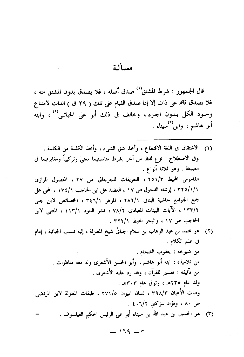 قال الجمهور: شرط المشتق (١) صدق أصله، فلا يصدق بدون المشتق منه، فلا يصدق قائم على ذات إلا إذا صدق القيام على تلك الذات لامتناع وجود الكل بدون الجزء، وخالف فى ذلك أبو على الجبائى (٢)، وابنه أبو هاشم، وابن (٣) سيناء.