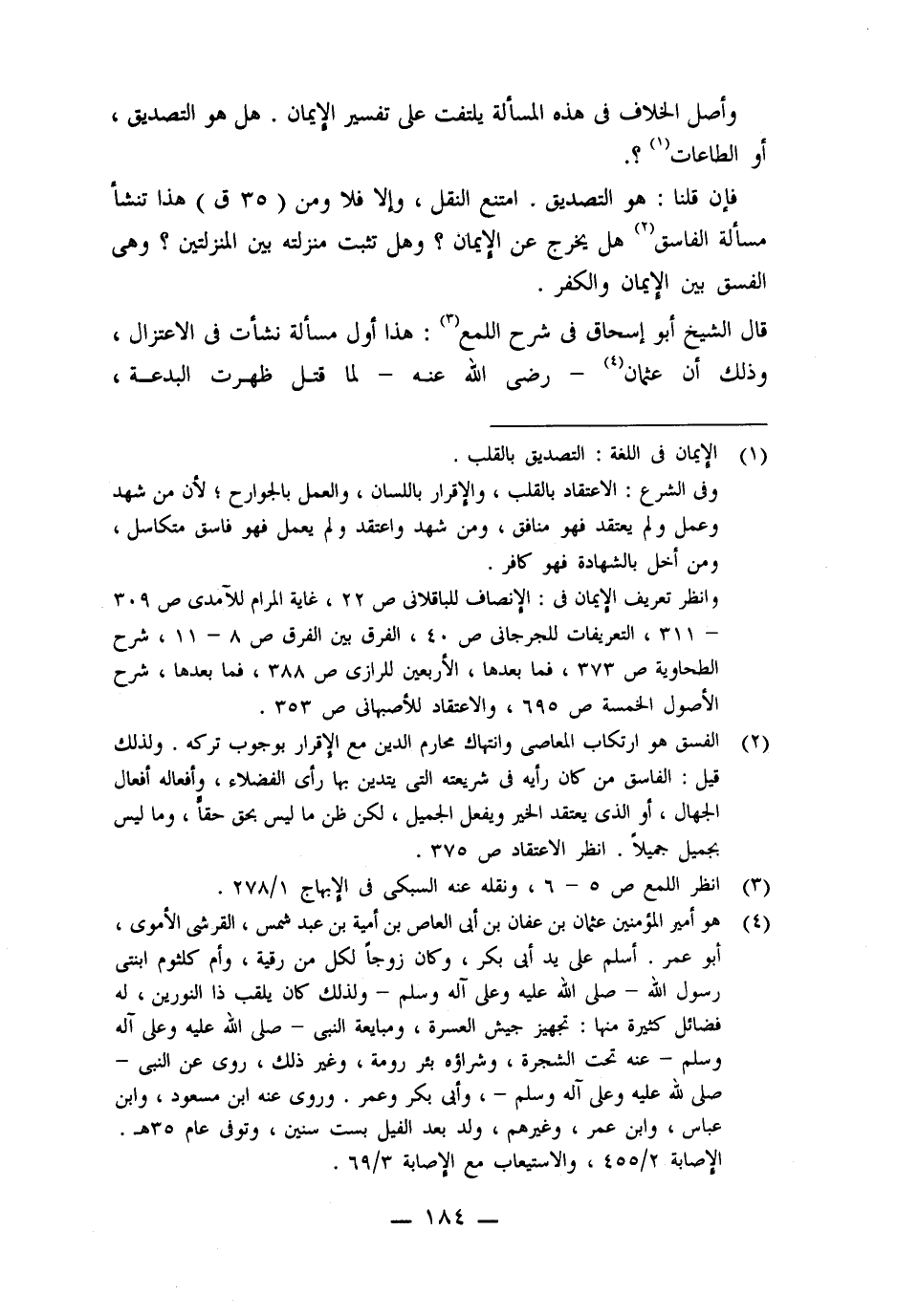 وانظر تعريف الإيمان فى: الإنصاف للباقلانى ص ٢٢، غاية المرام للآمدى ص ٣٠٩ - ٣١١، التعريفات للجرجانى ص ٤٠، الفرق بين الفرق ص ٨ - ١١، شرح الطحاوية ص ٣٧٣، فما بعدها، الأربعين للرازى ص ٣٨٨، فما بعدها، شرح الأصول الخمسة ص ٦٩٥، والاعتقاد للأصبهانى ص ٣٥٣.