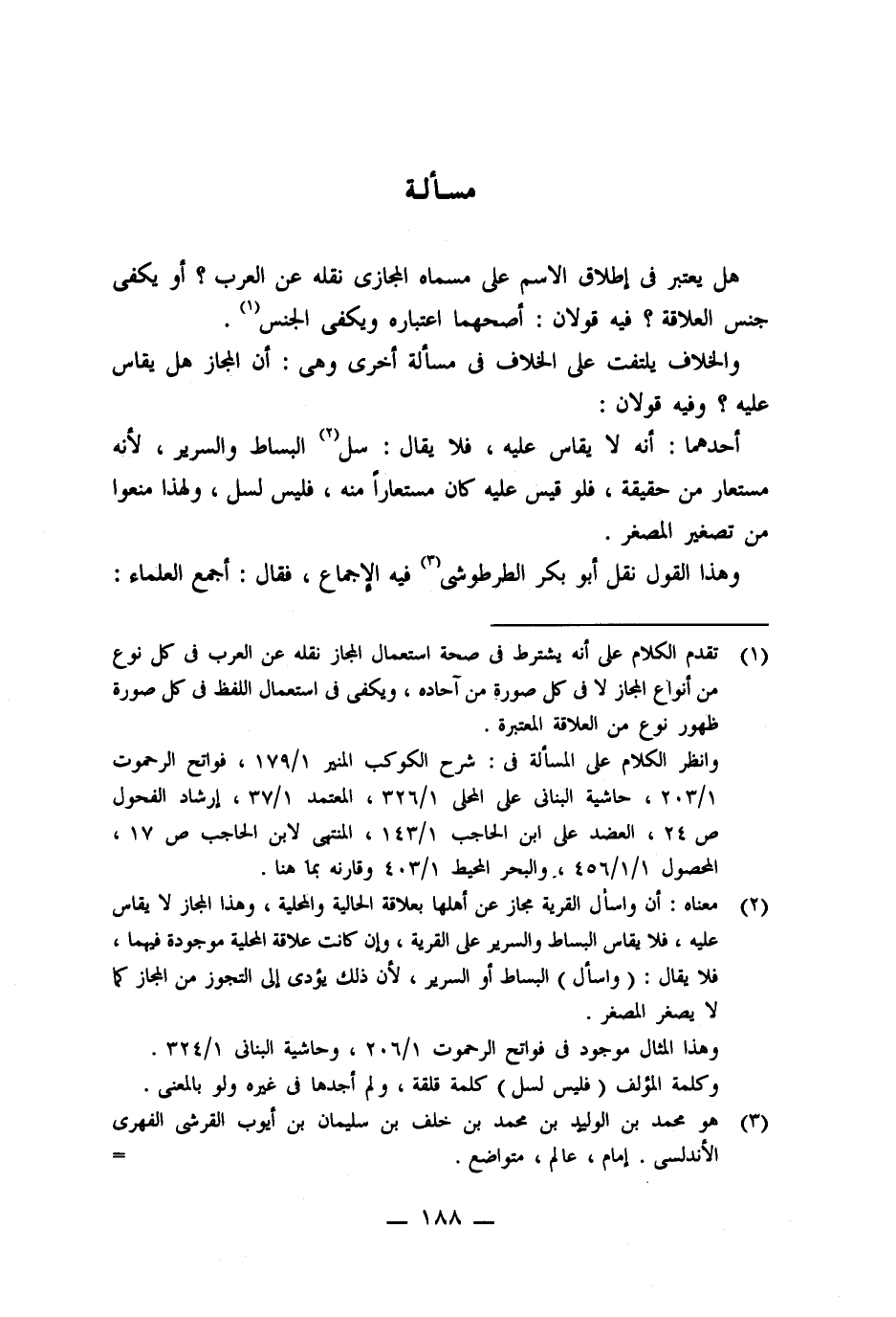 (٢) معناه: أن واسأل القرية مجاز عن أهلها بعلاقة الحالية والمحلية، وهذا المجاز لا يقاس عليه، فلا يقاس البساط والسرور على القرية، وإن كانت علاقة المحلية موجودة فيهما، فلا يقال: (واسأل) البساط أو السرور، لأن ذلك يؤدى إلى التجوز من المجاز كما لا يصغر المصغر.
