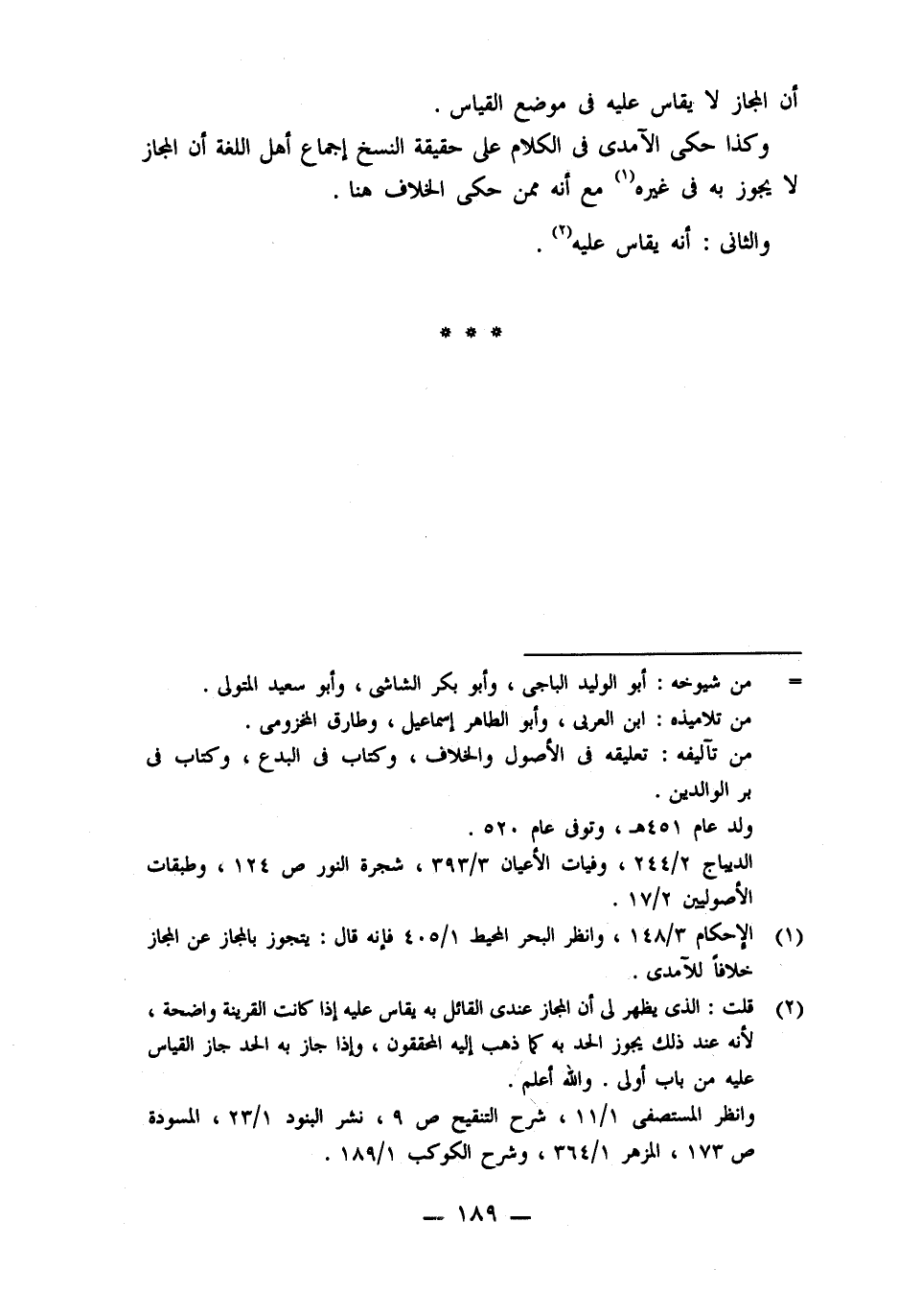 (٢) قلت: الذى ظهر لى أن المجاز عندى القائل به يقاس عليه إذا كانت القرينة واضحة، لأنه عند ذلك يجوز الحد كما ذهب إليه المحققون، وإذا جاز به الحد جاز القياس عليه من باب أولى. واللَّه أعلم.