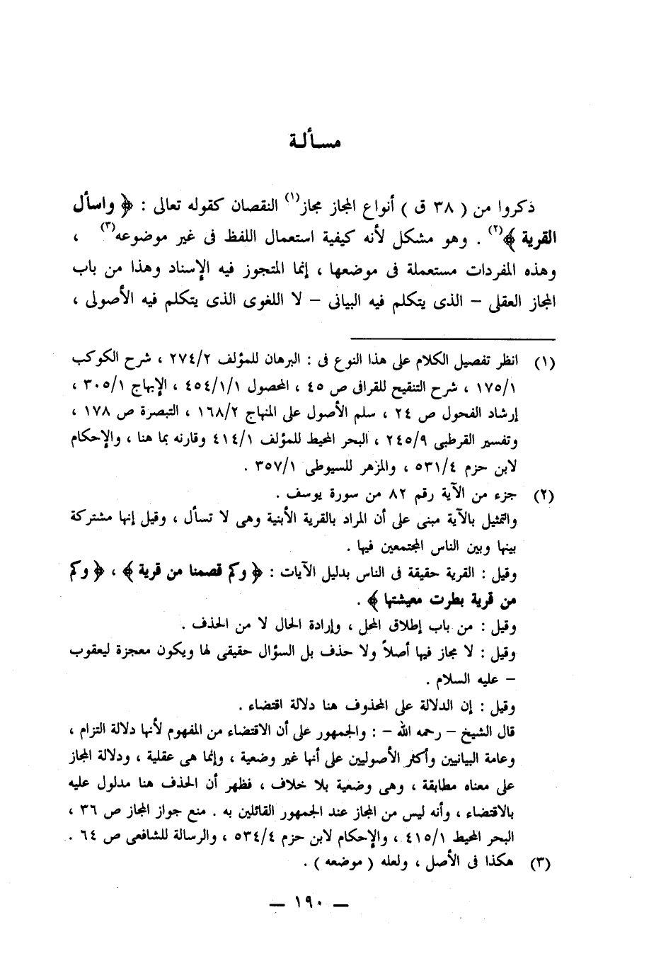 ذكروا من أنواع المجاز مجاز (١) النقصان كقوله تعالى: {وَاسْأَلِ الْقَرْيَةَ} (٢). وهو مشكل لأنه كيفية استعمال اللفظ فى غير موضوعه (٣)، وهذه المفردات مستعملة فى موضعها، إنما المتجوز فيه الإسناد وهذا من باب المجاز العقلى -الذى يتكلم فيه البيانى- لا اللغوى الذى يتكلم فيه الأصولى،