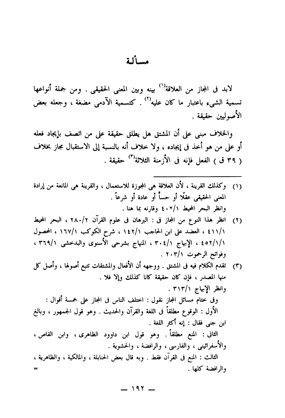 (١) وكذلك القرينة، لأن العلاقة هى المجوزة للاستعمال، والقرينة هى المانعة من إرادة المعنى الحقيقى عقلًا أو حسًا أو عادة أو شرعًا.
